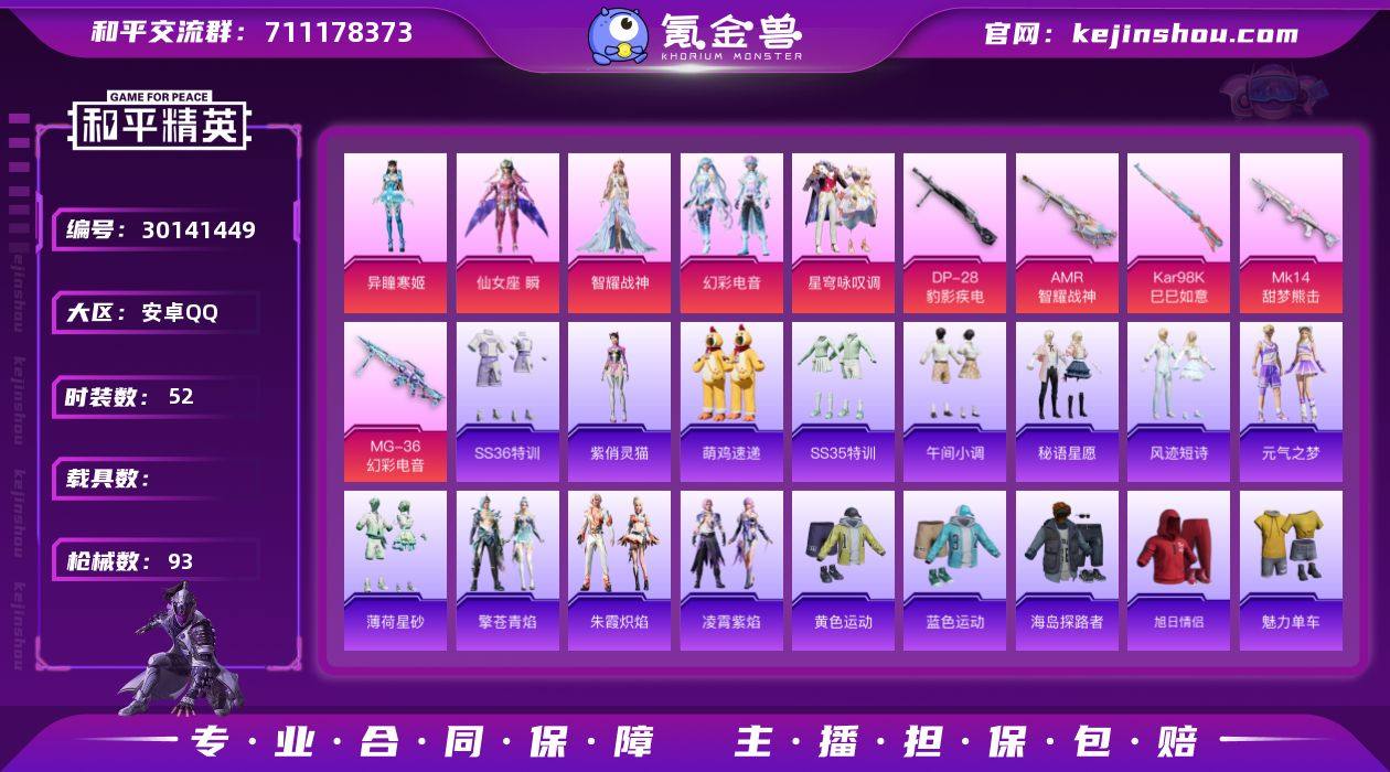 【0载具 5特效枪 5粉装 93枪皮 52套装】角色-异瞳寒姬,角色-仙女座 瞬,角色-智耀战神,套装-幻彩电音,套装-星穹咏叹调,AMR-智耀战神,Kar98K-巳巳如意,Mk14-甜梦熊击,DP-28-豹影疾电,MG-36-幻彩电音,极意拳锋飞行器,狂鲨锋刃飞行器,炫彩糖果飞行器,异域银装飞行器f3-31,编号:SXRWQ38