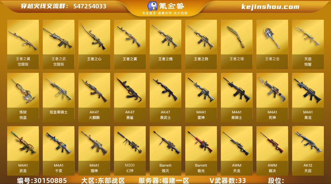 福建一区 可二次 53v M200-幻神 7盘龙+炼狱 6烈龙 HK417-朱雀 Barrett-毁灭 *3 (耀金+音效卡) Barrett-极光 *2 AWM-裁决 M4A1-雷神 王者之武觉醒版 M4A1-黑龙 M4A1-黑骑士 (耀金+音效卡) M4A1-千变 *3 M4A1-死神 M4A1-猎神 M4A1-武圣 AK47-火麒麟 *2 无影神兵利器 王者之翼觉醒版 AK47-黑武士 AK47-黑鲨 AK12-天启 烈火-9A-91 汤姆逊-烈龙 *6 6盘龙 RPK-盘龙 *7 加特林-炼狱 AWM-天龙 炫金骑士 天龙-曼陀罗 死亡之眼 【王者武器】 王者之心 王者之魄 王者之势 天启悦智 王者之翼 炼狱悦蓝 王者之锋 王者之击 *2 【副武器类型】 沙鹰-修罗 *2 沙鹰-天神 【近身武器类型】 屠龙 荣耀世冠-龙啸 龙啸 麒麟刺 *3 擎天 【稀有角色】 王者-零-传说之路 王者-零 王者-救世主 魅影 葵 樱 潘多拉X 影武者X 幻影 堕天使 炫彩背包 【武器皮肤及道具】 雷神-能量核心 雷神-虎将 火麒麟-心动糖果 火麒麟-CFSTAR 火麒麟-AG 火麒麟-平天大圣 毁灭耀金 黑骑士耀金 无影耀金 极光-能量核心 毁灭音效卡 黑骑士音效卡PX_2008488