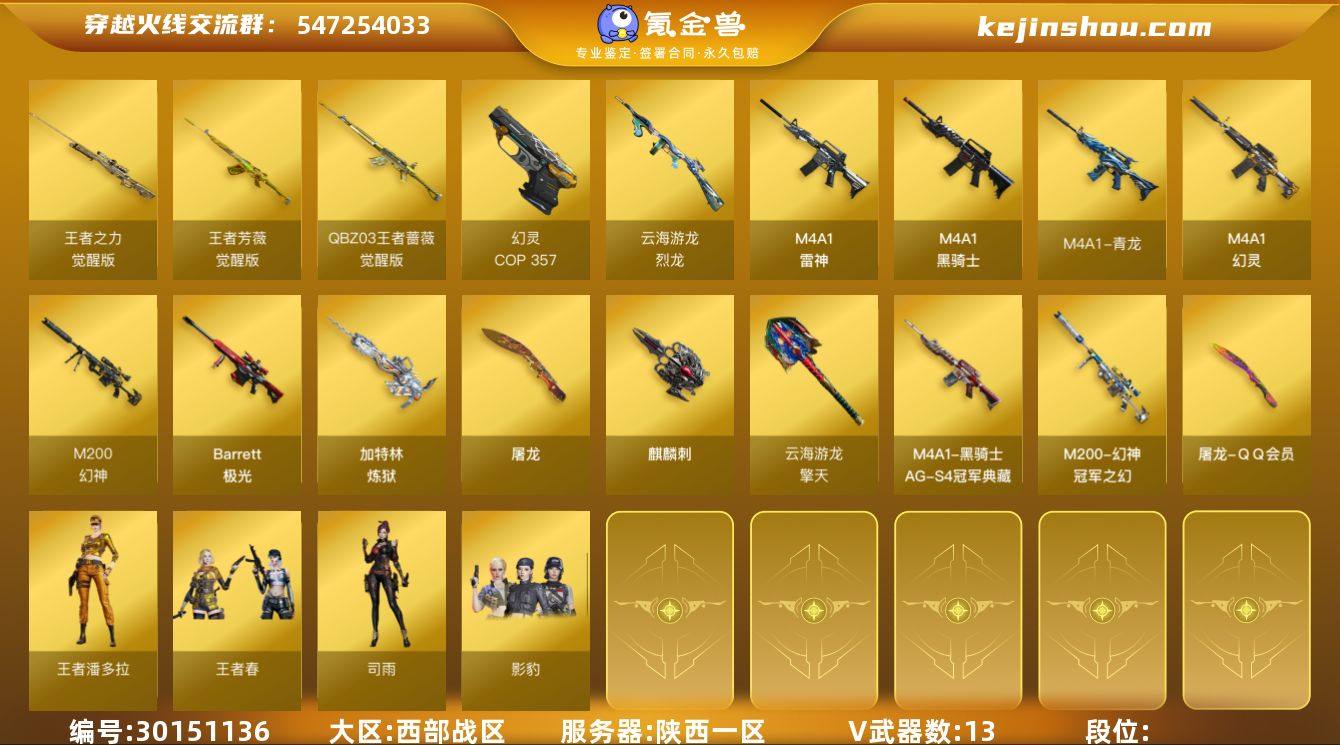 陕西一区 可二次 M200-幻神 (冠军之幻+幻灵+冠军之刃) 王者芳薇觉醒版 QBZ-03-王者蔷薇觉醒版 *2 Barrett-极光 王者之力觉醒版 M4A1-雷神 M4A1-黑骑士 M4A1-幻灵 M4A1-青龙 斯泰尔-枪娘暗刃 烈龙-云海游龙 加特林-炼狱 雷神小红 手雷-云海游龙 高爆手雷幻灵 *6 闪光弹幻灵 *6 烟雾弹幻灵 *6 【王者武器】 【副武器类型】 柯尔特赛博朋克 COP-幻灵 *2 Colt1911小故障 【近身武器类型】 Knife-冠军之刃 屠龙 麒麟刺 擎天-云海游龙 【稀有角色】 王者春 (4防) 王者潘多拉 (4防) 司雨 影豹 (4防) 云海玲珑 兰新年限定 麻雀 潘多拉X 复仇者 超级对讲机 【武器皮肤及道具】 幻神-冠军之幻 黑骑士-AG-S4冠军典藏 屠龙-QQ会员 炼狱音效卡 PX_1318166