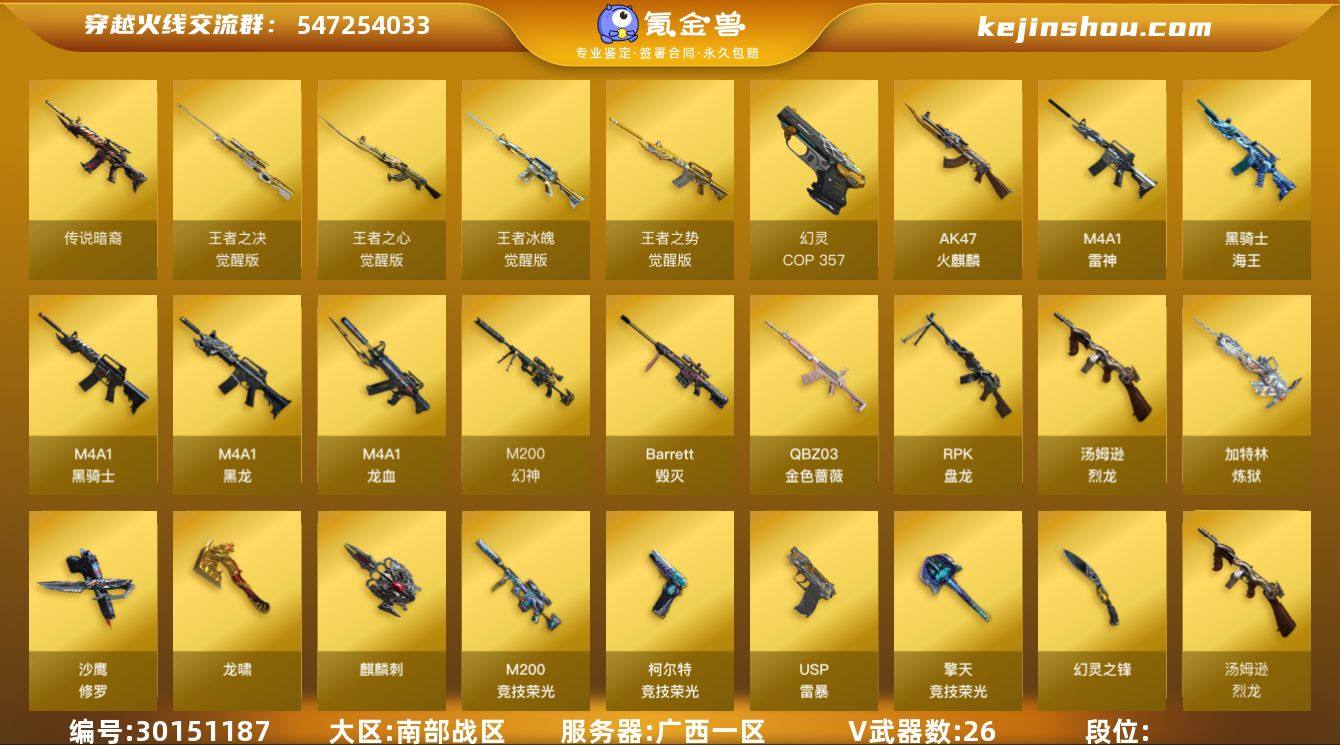 广西一区 可二次 55v M200-幻神 (宠儿+冠军之幻+冠军之刃) 传说暗裔 6烈龙+蝴蝶 4盘龙+2炼狱 (电子连击) M200-竞技荣光 Barrett-毁灭 王者之决觉醒版 王者冰魄觉醒版 M4A1-雷神 (N9+音效卡) QBZ03-金色蔷薇 (冠军之薇) M4A1-黑龙 王者之势觉醒版 M4A1-黑骑士 M4A1-龙血 *3 王者之心觉醒版 AK47-火麒麟 (传奇EVEN) 无影神兵利器 汤姆逊-烈龙 *6 6烈龙 斯泰尔-蝴蝶 RPK-盘龙 *4 加特林-炼狱 *2 炼狱-迷你小钢 黑骑士海王 M4小黄鸡 黄金AK 高爆手雷竞技荣光 *2 闪光弹竞技荣光 *2 烟雾弹竞技荣光 *2 高爆手雷幻灵 *3 闪光弹幻灵 *2 迷你生化手雷 【王者武器】 【副武器类型】 USP雷暴 柯尔特-竞技荣光 COP白鲨 COP-幻灵 沙鹰-修罗 *2 Colt1911小故障 【近身武器类型】 Knife-冠军之刃 幻灵之锋 龙啸 *2 麒麟刺 擎天-竞技荣光 龙啸-烈火龙威 金刚伞 夺魂 【稀有角色】 鹰 电竞教官-云悠悠 (四防) 王者春 (四防) 王者潘多拉 (四防) 王者凌霄 (四防) 空 职业选手 葵 木兰 修道士 麻雀 龙儿-小淘气 潘多拉X 影武者X 暗夜X 新娜塔莎 堕天使 复仇者 闪光护目镜 超级对讲机 超级背包 炫彩背包 【武器皮肤及道具】 幻神-宠儿-2021MVP 幻神-冠军之幻 QBZ03-冠军之薇 雷神耀金 雷神-传奇N9 雷神-虎将 AK47-火麒麟-传奇EVEN 火麒麟-冠军之心 火麒麟-AG 毁灭-风暴 M4A1-黑龙-361 炼狱-电子连击 M4A1-千变-孔明 修罗-星空 雷神音效卡 【稀有套装】 竞技荣光套 PX_1398534