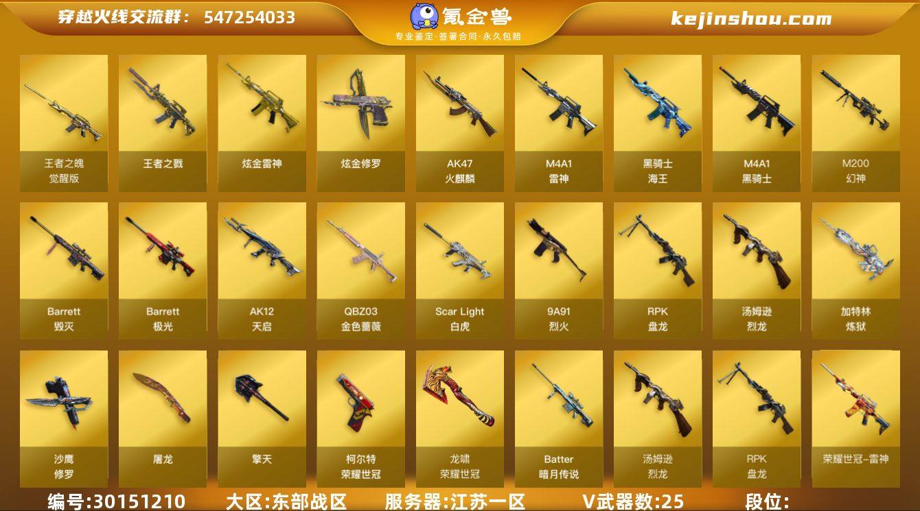 江苏一区 可二次 M200-幻神 (冠军之幻) 6盘龙+炼狱 6烈龙 Scar-白虎 荣耀世冠-火麒麟 荣耀世冠-雷神 Barrett-毁灭 Barrett-极光 王者之魄觉醒版 M4A1-雷神 QBZ03-金色蔷薇 M4A1-黑骑士 AK47-火麒麟 AK12-天启 烈火-9A-91 汤姆逊-烈龙 *6 6盘龙 RPK-盘龙 *6 加特林-炼狱 *2 炫金雷神 黑骑士海王 Barrett暗月传说 死亡之眼 AK47-B十周年 黄金AK 【王者武器】 王者之戮 【副武器类型】 荣耀世冠-柯尔特 沙鹰-修罗 *2 炫金修罗 Cfcolt1911大黄蜂 【近身武器类型】 屠龙 *3 荣耀世冠-龙啸 擎天 *4 猫猫手套 军用手斧镜 【稀有角色】 王者-瞳-闭月羞花 炽天使 职业选手 木兰 0号玩家 龙儿-小淘气 潘多拉X 暗夜X 铁骑荣耀 堕天使 超级对讲机 炫彩背包 【武器皮肤及道具】 幻神-冠军之幻 雷神-荣耀之魄 雷神-星空 火麒麟-CFSTAR 毁灭-冠军之怒 毁灭-BEAN-2020MVP 天龙-CFSTAR 极光-能量核心 M4A1-千变-孔明 修罗-星空 毁灭音效卡 雷神音效卡 极光音效卡 绝迹语音包 【稀有套装】 荣耀世冠套 PX_2003913