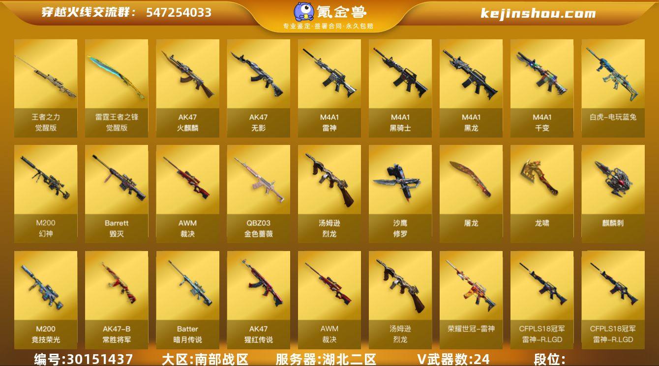 湖北区 可二次 M200-幻神 (AG冠军+巅峰荣耀+CFS2022) M200-竞技荣光 荣耀世冠-雷神 白虎电玩蓝兔 Barrett-毁灭 *2 (SV冠军) 王者之力觉醒版 AWM-裁决 M4A1-雷神 *2 (荣耀之魄+N9) QBZ03-金色蔷薇 (冠军之薇) M4A1-黑龙 M4A1-黑骑士 M4A1-千变 AK47-火麒麟 *2 AK47-无影 无影神兵利器 汤姆逊-烈龙 *4 火麒麟绝迹 裁决-雪莉杨 AK常胜将军 AK猩红传说 Barrett暗月传说 死亡之眼 黄金AK 高爆手雷竞技荣光 *3 闪光弹竞技荣光 *3 烟雾弹竞技荣光 *3 高爆手雷雷霆 闪光弹雷霆 烟雾弹雷霆 迷你生化手雷 【王者武器】 【副武器类型】 沙鹰-修罗 *2 Cfcolt1911大黄蜂 【近身武器类型】 屠龙 *3 雷霆王者之锋觉醒版 尼泊尔-雷霆 龙啸 *3 麒麟刺 *2 金刚伞电玩红兔 迷你深渊冰龙 【稀有角色】 王者-瞳-闭月羞花 职业选手 木兰 新娜塔莎 幻影 堕天使 复仇者 【武器皮肤及道具】 幻神-AG-CFPLS17冠军 幻神-CFS2022 幻神-巅峰荣耀 QBZ03-冠军之薇 雷神-荣耀之魄 雷神-R.LGD-CFPLS18冠军 雷神-宇航兔 雷神-星空 雷神-传奇N9 火麒麟-心动糖果 火麒麟-CFSTAR 火麒麟-平天大圣 毁灭-墨兰 毁灭-星空 黑龙-能量核心 天龙-CFSTAR AWM-天龙-传奇70KG AWM-天龙-传奇白鲨 修罗-星空 龙啸-冠军之啸PX_1203272