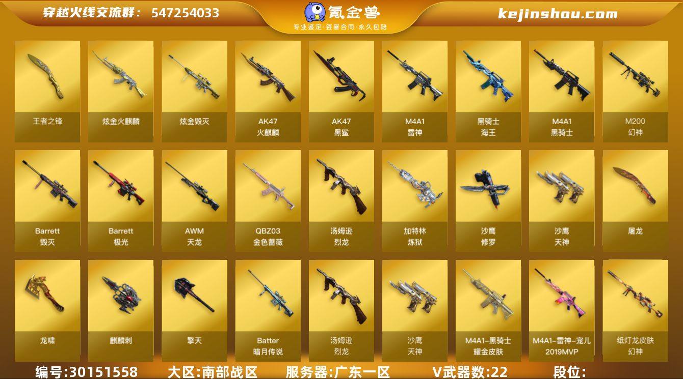 广东一区 可二次 M200-幻神 (宠儿+N9+纸灯龙) 6烈龙+死眼 Barrett-毁灭 (耀金+音效卡) Barrett-极光 *2 AWM-天龙 M4A1-雷神 (宠儿) QBZ03-金色蔷薇 (纸灯龙) M4A1-黑骑士 AK47-火麒麟 AK47-黑鲨 汤姆逊-烈龙 *6 加特林-炼狱 炫金火麒麟 炫金毁灭 黑骑士海王 Barrett暗月传说 死亡之眼 AK47-B十周年 高爆手雷幻灵 烟雾弹幻灵 【王者武器】 王者之锋 【副武器类型】 沙鹰-修罗 *5 沙鹰-天神 Cfcolt1911大黄蜂 【近身武器类型】 屠龙 *2 龙啸 麒麟刺 擎天 【稀有角色】 葵 樱 黄金海岸 龙儿 潘多拉X 暗夜X 铁骑荣耀 幻影 堕天使 复仇者 炫彩背包 【武器皮肤及道具】 幻神-宠儿-2021MVP M200-幻神-N9-2022MVP 幻神-纸灯龙 QBZ03-纸灯龙 雷神-宠儿-2019MVP 毁灭耀金 黑骑士耀金 天龙-能量核心 极光-能量核心 毁灭音效卡 黑骑士音效卡 PX_1353233