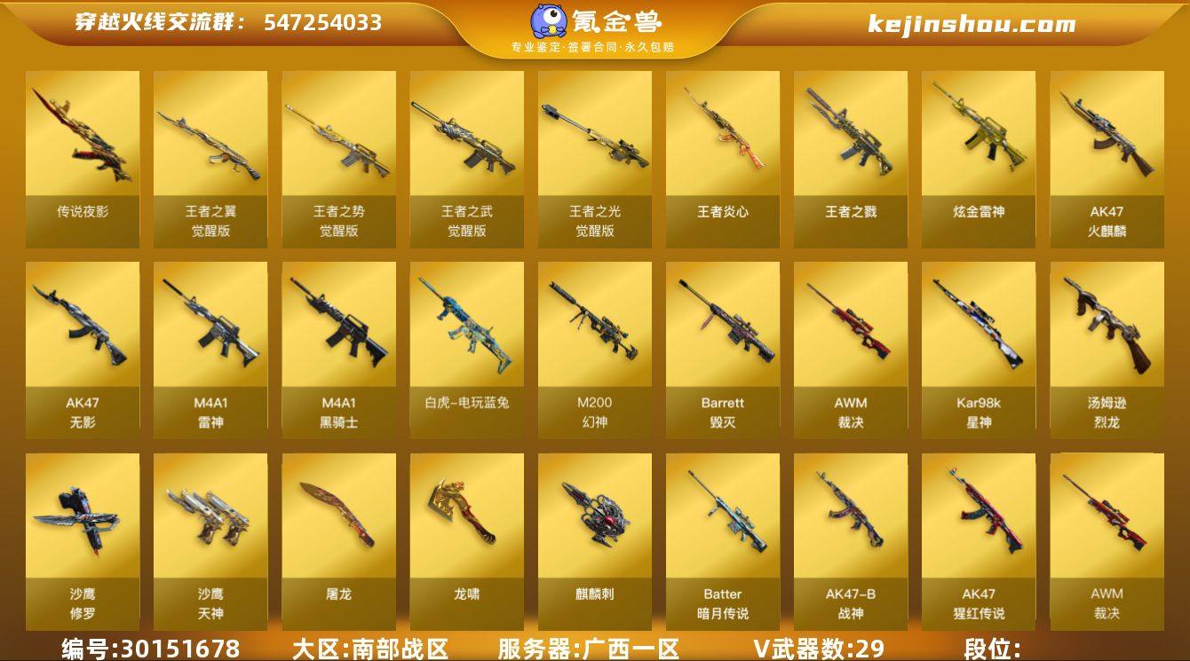 广西一区 可二次 60v M200-幻神 (世冠白鲨) Kar98K-星神 (漫游) 传说夜影 QBZ-03-天罚 白虎电玩蓝兔 USP-神工天巧 *2 Barrett-毁灭 (星空+音效卡) 王者之光觉醒版 AWM-裁决 M4A1-雷神 王者之武觉醒版 王者之势觉醒版 M4A1-黑骑士 (冠军之势+音效卡) AK47-火麒麟 *2 AK47-无影 无影神兵利器 王者之翼觉醒版 烈火动感闪耀 汤姆逊-烈龙 *3 炫金雷神 炼狱-迷你小钢 AKB-战神 AK猩红传说 Barrett暗月传说 试炼破坏者 黄金AK 高爆手雷神工天巧 *5 闪光弹神工天巧 *5 烟雾弹神工天巧 *6 动感闪耀手雷 【王者武器】 王者炎心 王者之戮 【副武器类型】 USP-神工天巧 *2 沙鹰-修罗 *6 沙鹰-天神 天神动感闪耀 【近身武器类型】 屠龙 *2 屠龙动感闪耀 龙啸 麒麟刺 *3 唐刀-神工天巧 金刚伞电玩红兔 【稀有角色】 女主播 葵 木兰 乔伊教练 零热舞青春 潘多拉X 铁骑荣耀 新娜塔莎 幻影 堕天使 超级护目镜 闪光护目镜 超级对讲机 炫彩背包 【武器皮肤及道具】 M200-幻神-荣耀世冠白鲨 星神-漫游 雷神动感闪耀 雷神耀金 火麒麟-心动糖果 火麒麟-CFSTAR 毁灭-直播专属 毁灭-星空 毁灭-暗月 黑骑士-冠军之势 天龙-能量核心 M4A1-千变-孔明 麒麟刺-甜蜜糖果 毁灭音效卡 黑骑士音效卡 PX_2007244