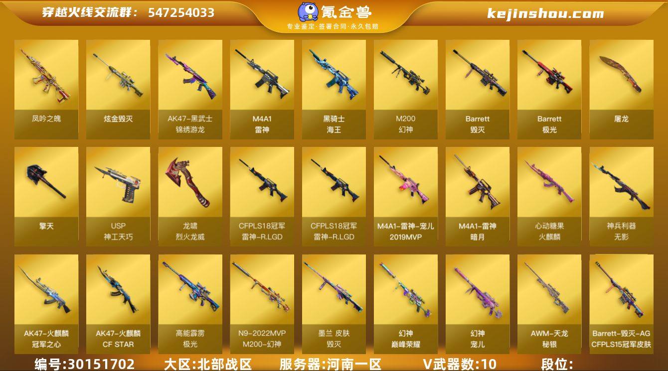 河南一区 可二次 M200-幻神 (宠儿+巅峰荣耀+N9-2022MVP) 凤吟之魄 Barrett-毁灭 (冠军AG+CFS2020) Barrett-极光 (高能霹雳) M4A1-雷神 (LGD+宠儿+音效卡) 无影神兵利器 黑武士-锦绣游龙 炫金毁灭 炼狱-迷你小钢 牛牛-AK47 黑骑士海王 AK47-B十周年 黄金AK 高爆手雷神工天巧 闪光弹神工天巧 *3 烟雾弹神工天巧 【王者武器】 凤吟之魄 【副武器类型】 USP-神工天巧 Colt1911小故障 【近身武器类型】 屠龙 擎天 猫猫手套 龙啸-烈火龙威 【稀有角色】 新海豹突击队 灵动武士 木兰 云海玲珑 兔囡囡 潘多拉X 暗夜X 铁骑荣耀 堕天使 闪光护目镜 超级对讲机 超级背包 【武器皮肤及道具】 幻神-宠儿-2021MVP M200-幻神-N9-2022MVP 幻神-巅峰荣耀 雷神-宠儿-2019MVP 雷神-R.LGD-CFPLS18冠军 雷神-暗月 火麒麟-心动糖果 火麒麟-CFSTAR 火麒麟-冠军之心 黑鲨-电流骇客 毁灭-AG-CFPLS15冠军 毁灭-墨兰 极光-高能霹雳 天龙-秘银 屠龙-荣耀之锋 擎天-冠军之击 麒麟刺-萌杀 雷神音效卡PX_1313345