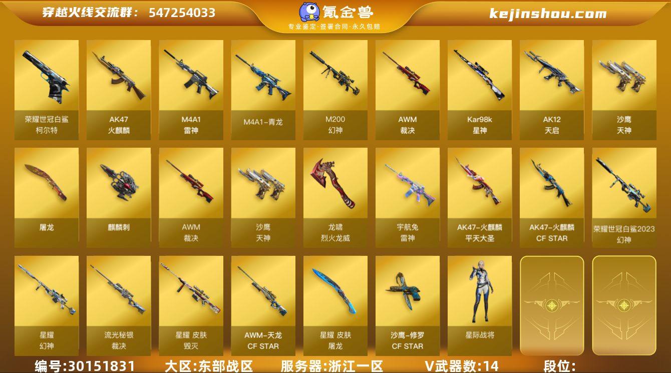 浙江一区 可二次 M200-幻神 (世冠2023白鲨+星耀) Kar98K-星神 (音效卡) 柯尔特-荣耀世冠白鲨2023 AWM-裁决 (流光秘银) M4A1-雷神 死神-雪域霜狐 M4A1-青龙 AK47-火麒麟 AK12-天启 黄金AK 闪光弹雷暴 【王者武器】 【副武器类型】 柯尔特-荣耀世冠白鲨2023 真的是手枪 沙鹰-天神 *4 Colt1911小故障 Cfcolt1911大黄蜂 【近身武器类型】 屠龙 *2 麒麟刺 荣耀之证 龙啸-烈火龙威 【稀有角色】 星际战将 木兰 0号玩家 兰新年限定 黄金海岸 蜀雪 潘多拉X 影武者X 暗夜X 幻影 堕天使 复仇者 透明头盔 闪光护目镜 超级对讲机 超级背包 【武器皮肤及道具】 幻神-荣耀世冠白鲨2023 幻神-星耀 雷神-宇航兔 火麒麟-CFSTAR 火麒麟-平天大圣 毁灭-星耀 裁决-流光秘银 天龙-CFSTAR 修罗-CFSTAR 屠龙-星耀 星神音效卡PX_2206875