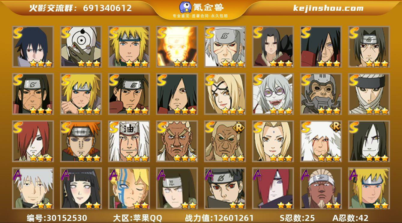 IOS/25S忍/42A忍/战力1260W/V11/区服13 【S忍者】 宇智波斑「秽土转生·解」,宇智波佐助「永恒万花筒」,漩涡鸣人「九喇嘛连结」,千手柱间「秽土转生」,自来也「舞之豪杰」,宇智波鼬「秽土转生」,药师兜「仙人模式」,宇智波斑「秽土转生」,艾「三代目雷影」,宇智波斑「白面具」,半藏「秽土转生」,千手扉间「秽土转生」,纲手「百豪」,波风水门「秽土转生」,无「二代目土影」,长门「秽土转生」,宇智波斑,千手柱间,艾「四代目雷影」,宇智波鼬「须佐能乎」,佩恩「天道」,波风水门,大蛇丸,自来也,纲手, 【A忍者】 长十郎「六代目水影」,日向宁次「忍界大战」,漩涡博人「桃式显现」,日向雏田「最终章」,旗木卡卡西「幻之真容」,宇智波止水,长门「青年」,艾「青年」,波风水门「青年」,奇拉比「忍界大战」,宇智波佐助「须佐能乎」,迪达拉「秽土转生」,漩涡鸣人「九尾查克拉」,千代「近松十人卫」,药师兜「半蛇斗篷」,宇智波鼬「新春限定」,宇智波佐助「疾风传咒印」,我爱罗「忍界大战」,秋道丁次「忍界大战」,大蛇丸「晓」,猿飞阿斯玛「秽土转生」,春野樱「百豪」,照美冥「五代目水影」,宇智波佐助「万花筒写轮眼」,奇拉比,漩涡鸣人「仙人模式」,旗木卡卡西「万花筒写轮眼」,角都「地怨虞」,飞段「死司凭血」,角都,小南,飞段,迪达拉,我爱罗「疾风传」,蝎,干柿鬼鲛,宇智波鼬,猿飞阿斯玛,迈特凯,桃地再不斩, PX_2221467