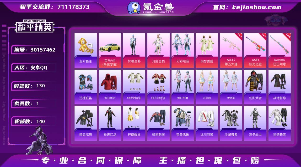 XY 安卓 手Q-4粉装-3特效枪-1载具-2粉色飞行器-50369热力值-8王牌印记-130套装-140枪皮 【热门品类】:套装-派对舞王,套装-龟仙人 【粉色套装】:粉装-闲梦青缨,角色-月影灵韵,角色-伏羲圣卦,粉装-幻彩电音 【粉色枪皮等级】:Kar98K-巳巳如意(五级),AMR-炫光之旅(七级),M417-第五大道(七级) 【粉色载具】:宝马M4(圣保罗黄) 【粉色枪皮】:Kar98K-巳巳如意,AMR-炫光之旅,M417-第五大道 【粉色飞行器】:齐天大圣飞行器,千面幻镜飞行器 【粉色降落伞】:恐龙拽拽降落伞,垂柳戏鸭降落伞,旋转彩虹降落伞,未来歌姬降落伞,闲梦青缨降落伞,萌物绒绒降落伞,炫光之旅降落伞,精灵梦叶罗丽降落伞,临安公主降落伞,樱桃泡泡降落伞,圣斗士星矢降落伞,星穹咏叹调降落伞 【稀有套装】:套装-龟仙人,套装-巳巳如意,套装-雏菊兔兔,套装-萝兰蝴蝶,套装-小熊娃娃,角色-狂花道·雅典娜,套装-燕燕于飞,套装-鱼渊荷华,套装-粉恋花,套装-紫幽梦,套装-蓝冰羽,角色-瑰梦爱神,套装-霓虹热舞,套装-云朵鹅,套装-雪绒豹 【稀有枪皮】:AKM-2P战斗服款,AKM-彩虹符号,AKM-恐龙拽拽,AKM-缤纷海域,AKM-龙的传人,M16A4-幻世战舞者,SCAR-L-玉兔迎春,M416-糯团青竹,M416-红色方程式,M416-蓝色火焰,GROZA-影袭,GROZA-懵萌河马,AUG-甜蜜菠萝,AUG-耀粉歌者,M762-天降萌叽,M762-云朵鹅,Mk47-炫光之旅,G36C-懵萌河马,AC-VAL-天降萌叽,蜜獾-天降萌叽,蜜獾-娇憨猪猪,UZI-天降萌叽,UZI-娇憨猪猪,UZI-影袭,UMP45-涂山之恋,UMP45-炫光之旅,Vector-焰鹰斗篷,Vector-彩虹符号,汤姆逊-天降萌叽,汤姆逊-炫彩节奏,汤姆逊-耀粉歌者,P90-巳巳如意,Kar98K-红色方程式,M24-影袭,AWM-焰鹰斗篷,SKS-未来歌姬,SKS-糯团青竹,VSS-彩虹符号,Mini14-涂山之恋,Mini14-耀粉歌者,SLR-娇憨猪猪...