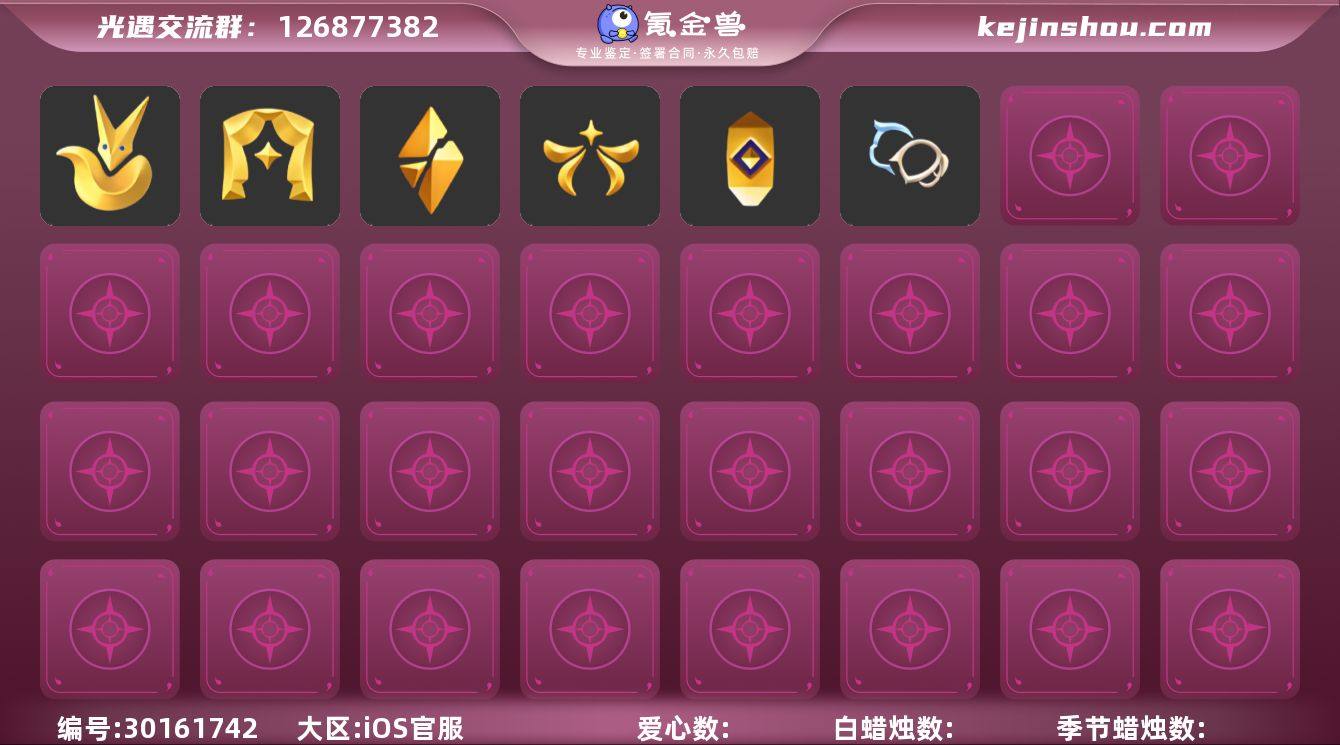 [17188173]安卓官服 手机账号 2珍稀物品 8毕业季 3毕业图 108蜡烛 【珍稀物品】白枭(帝企鹅发),透明蝶翼斗 【季节已毕业】风行季,潜海季,表演季,破晓季,欧若拉季(欧若拉),追忆季,九色鹿(九色鹿季),筑巢季 【完成地图】雨林,霞谷,墓土(暮土) 【礼包】青衫落拓礼包,新年裤(瑞气服饰),水母(水母肩饰),巫师(巫师帽),绊爱(绊爱斗篷)(绊爱礼包),雪花(雪花发夹),贝壳(贝壳发饰),兔子(玉兔头饰)(玉兔发饰)(兔子发饰),星月头饰(星月头冠),新年耳钉(金鳞耳饰),彩虹耳钉(彩虹耳饰),枯角(巫树犄角),鹿角(圣诞鹿角),创始人(创始人斗篷),蝙蝠套(蝙蝠斗篷)(南瓜头),蜘蛛斗(蛛丝斗篷)(蛛网斗篷),猫套(皮皮猫斗)(皮皮猫礼包),吉他(音韵吉他)(白吉他),红伞(瑞气纸伞),献瑞折扇礼包,茶桌(花憩茶桌) 【裤子】筑巢季·裤子(设计师长袍),飞天裤(柔缎花边连)(九色鹿丝带裤),王子服(小王子套装),蓝绿裤(高领舞服),武士裤,搓澡巾 【面具】黄眉企鹅面具,夜行毕业面具(棕熊面具),呼吸面具(潜水面具) 【面饰】青鸟毕业面饰(青鸟面饰),红耳机 【项链】围巾(肩带) 【发型】小王子发型,单侧绑发(单边小辫),留辫蘑菇头,飞天盘发(九色鹿丸子头),虚荣,归巢毕业发型(五塑彩羽发),若笠(箬笠) 【头饰】平顶帽,羽毛发饰(多羽发饰) 【斗篷】燕尾斗篷,冥龙斗篷,遥鲲斗篷(双翼遥鲲斗),绿芽,海洋斗 【配饰】鲲灯(追忆之书),雨伞,筑巢季·小手办(光之子试衣),高音钢琴(白色高脚钢琴)