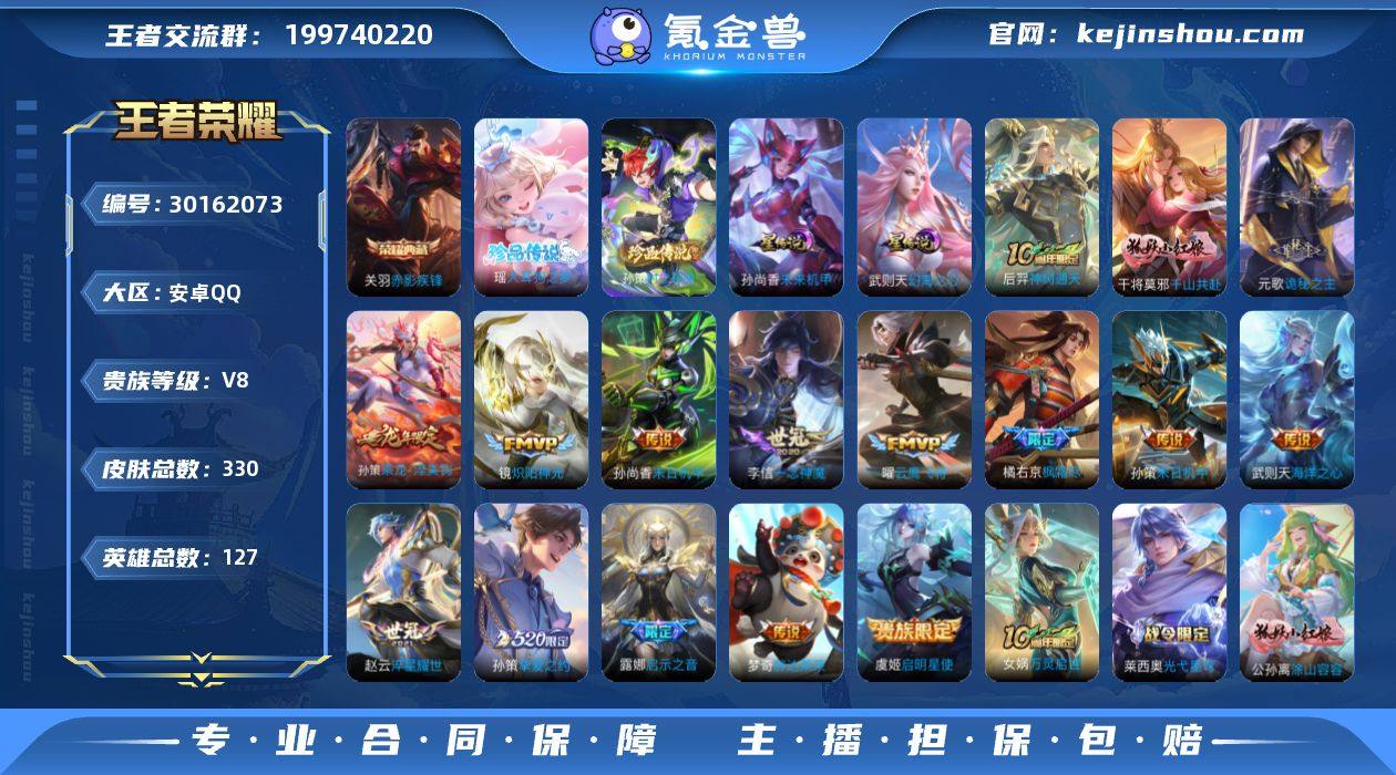 贵族等级:V8 典藏皮肤数:1 珍品无双皮肤数:0 无双皮肤数:0 珍品传说皮肤数:2 传说皮肤数:16 史诗皮肤数:89 皮肤数:330 英雄数:127 段位:荣耀王者 卖家说:王者v8/CFMv6+金铲铲v7连体
