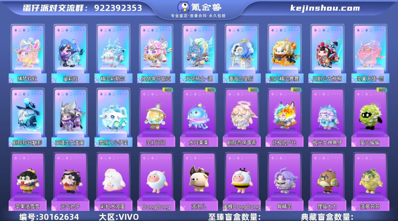捕梦软软,川剧少女梧桐,独角兽芬妮亚,精灵莉斯尔,剧院院长魅影,流火精灵舞舞,苗疆圣女蚩离,蔷薇白皇后,鲨莉娃,圣翼天使-恋,天穹骑士-湛,雪原之心伊芙 段位:超级凤凰蛋 卖家说:号有12个至臻,有精灵莉斯尔,白皇后,天穹骑士…5个隐藏,有龙车,累充车,背饰有月白之隐,碎晶幻翼,闪闪星蝶,11w+潮流,果宝特攻三个抽全了,羊有dongdong和蜜蜂dongdong,有各种绝版动作和绝版表情!氪条9.2w蛋币,历史最高3442名以及一个粉嫩郁金香系庄园~