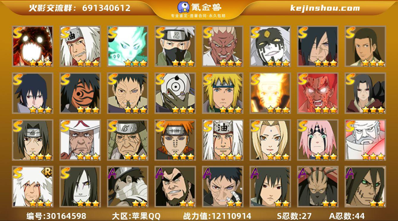 IOS/27S忍/44A忍/战力1211W/V12/区服542 【S忍者】 宇智波止水「须佐能乎」,艾「忍界大战」,大筒木桃式,宇智波斑「秽土转生·解」,千手柱间「木叶创立」,宇智波佐助「永恒万花筒」,神秘面具男「红夜之刃」,春野樱「忍界大战」,大筒木金式,漩涡鸣人「九喇嘛连结」,迈特凯「死门」,宇智波带土「忍界大战」,自来也「舞之豪杰」,旗木卡卡西「须佐能乎」,大筒木舍人「最终章」,自来也「传说中的三忍」,漩涡鸣人「暴怒·第六尾」,宇智波鼬「秽土转生」,宇智波斑「白面具」,猿飞日斩「秽土转生」,宇智波鼬「须佐能乎」,佩恩「天道」,猿飞日斩,波风水门,大蛇丸,自来也,纲手, 【A忍者】 长十郎「六代目水影」,不缘,我爱罗「新春限定」,日向宁次「忍界大战」,漩涡博人「桃式显现」,旗木卡卡西「幻之真容」,小南「漂泊浪客」,李洛克「忍界大战」,蝎「绯流琥」,宇智波泉奈,宇智波带土「漂泊浪客」,神农「羁绊」,桃地再不斩「秽土转生」,角都「秽土转生」,长门「青年」,佩恩·六道「漂泊浪客」,艾「青年」,达鲁伊「五代目雷影」,波风水门「青年」,千手扉间「漂泊武士」,奇拉比「忍界大战」,宇智波止水「新春限定」,宇智波佐助「须佐能乎」,加藤断,桃地再不斩「漂泊武士」,旗木卡卡西「忍界大战」,千代「近松十人卫」,秋道丁次「忍界大战」,照美冥「五代目水影」,宇智波佐助「万花筒写轮眼」,角都「地怨虞」,飞段「死司凭血」,角都,小南,飞段,迪达拉,我爱罗「疾风传」,蝎,干柿鬼鲛,宇智波鼬,猿飞阿斯玛,迈特凯,卑留呼「火之意志继承者」, PX_2235896