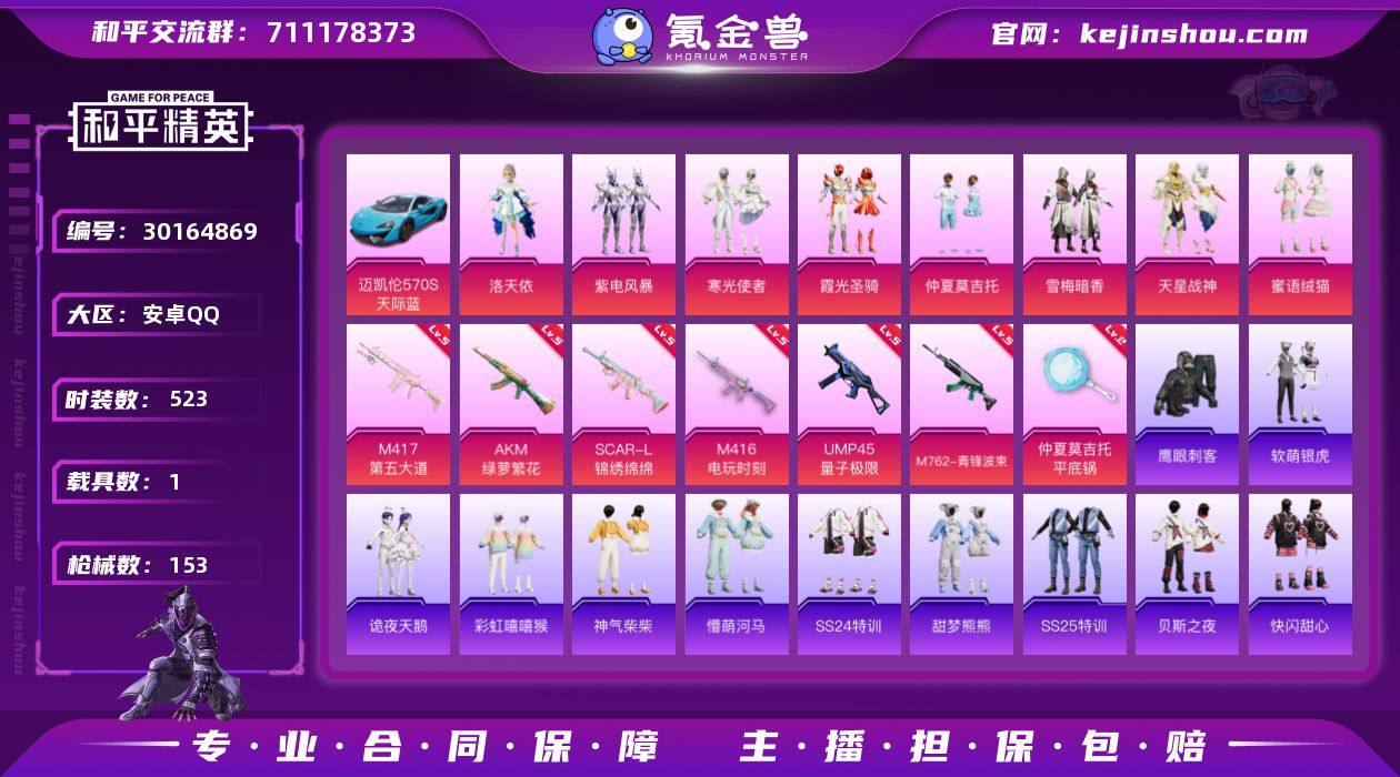 (可二次实名) 安卓Q-1载具8粉装7特效枪7热门135套装153枪皮 50685热力值 3印记 历史超级王牌5星 【1载具】 迈凯伦570S天际蓝 【8粉装】 蜜语绒猫 洛天依 雪梅暗香 天星战神 仲夏莫吉托 霞光圣骑 紫电风暴 寒光使者 【7特效枪】 SCAR-L-锦绣绵绵 (5级) M416-电玩时刻 (5级) AKM-绿萝繁花 (5级) M762-青锋波束 (5级) UMP45-量子极限 (5级) M417-第五大道 (5级) 平底锅-仲夏莫吉托 (2级) 【7热门】 龟仙人 鹰眼刺客 软萌银虎 纯白誓言 破蛋小黄鸡 极速红龙 弄潮海豚 【1飞行器】 白勺歌姬飞行器 【1头盔】 梦幻火箭头盔 【2背包】 梦幻火箭背包 深海小丑鱼背包 营地ID:709112445 PX_2232913