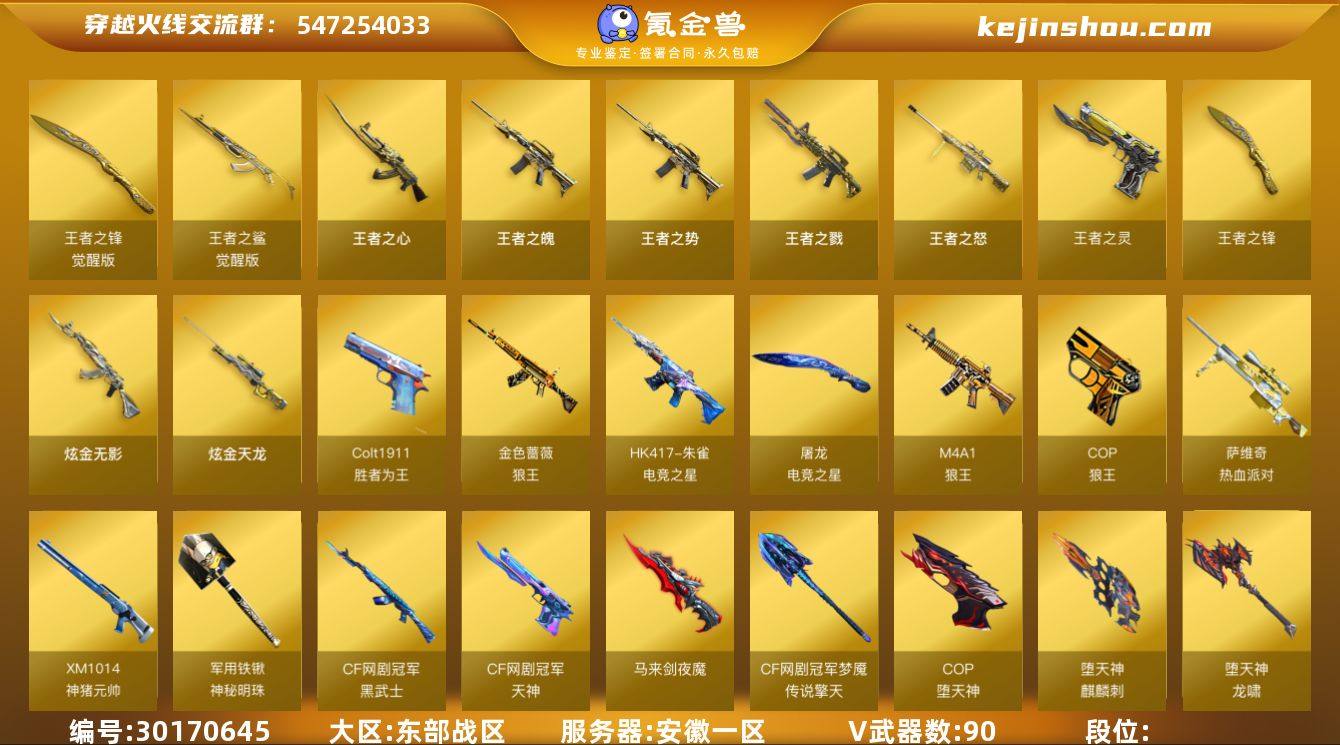东部战区(安徽一区)【精品生化爆破号】90v【M200-幻神套装+皮/动感闪耀,堕天神套装,6烈龙+斯泰尔-蝴蝶,QBZ03-金色蔷薇+皮/电竞之星,HK417-朱雀,AWM-裁决+双皮/运输船/胜者为王,COP-堕天神*2,破空枪刃-夜魔,Colt1911-大黄蜂】16王者【王者之心,王者之鲨,王者之戮,王者之魄,王者之势,王者之怒,王者之灵,王者之锋,烈龙-悦心】3炫金【炫金无影,炫金天龙】7角色【四防王者-葵-貂蝉,迷迭香,魅影,王者-瞳-闭月羞花,王者复仇】7音效【M200-幻神-竞星跃动音效卡,Barrett-毁灭音效卡,AK47-火麒麟音效卡,M4A1-雷神音效卡,M4A1-黑骑士音效卡,HK417-朱雀-电竞之星-竞星跃动音效卡,屠龙-电竞之星-竞星跃动音效卡】20皮【幻神-动感闪耀,金色蔷薇-电竞之星,裁决-运输船,裁决-胜者为王,毁灭-冠军之怒,毁灭-CFS2018,雷神-虎将,火麒麟-CF STAR,火麒麟-华夏之心,黑骑士-耀金,雷神-星空,火麒麟-传奇EVEN,毁灭-星空】 小人枪【雷神-精英刀锋,火麒麟-灵狐,火麒麟-绝迹,斯泰尔-蝴蝶,COP-旗袍】VIP1截图展示段位不代表实际段位 如赛季更新等不可抗拒因素发生变化、时限道具不保证所剩时间