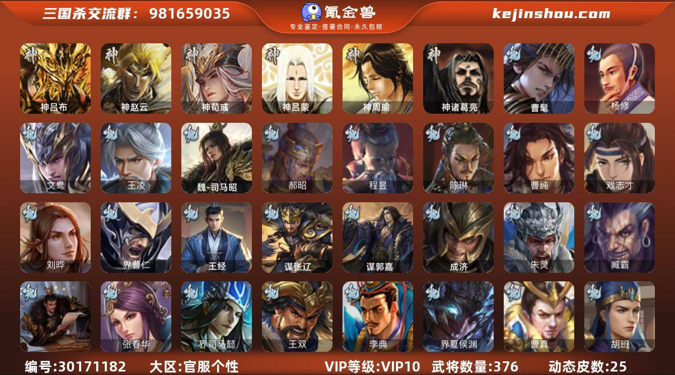 VIP等级: VIP10 官阶: 大将军 武将数量: 376 动态皮肤数量: 25 神将: 神吕布,神荀彧,神赵云,神吕蒙,神周瑜,神诸葛亮 魏国武将: 刘晔,戏志才,曹纯,陈琳,程昱,郝昭,魏-司马昭,王凌,文鸯,杨修,张辽,SP蔡文姬,SP关羽,SP贾诩,SP姜维,SP庞德,卞夫人,蔡贞姬,曹昂,曹操,曹冲,曹洪,曹丕,曹仁,曹叡,曹嵩,贾逵,王异,张恭,鲁芝,界满宠,曹休,界曹植,满宠,荀攸,王基,钟繇,蒯越蒯良,郭嘉,牵招,荀彧,杜畿,界郭嘉,崔琰,界曹丕,界荀彧,朱灵,界甄姬,吕虔,界王异,界许褚,界郭淮,华歆,陈群,界邓艾,界典韦,袁涣,乐进,郭淮,郭皇后,夏侯惇,曹植,司马朗,谋于禁,界曹操,许褚,界张辽,谋徐晃,张郃,钟会,文聘,曹彰,界夏侯惇,诸葛诞,司马懿,甄姬,杨阜,界徐晃,徐晃,界曹仁,孙资刘放,韩浩史涣,胡班,曹真,典韦,界夏侯渊,谋荀彧,夏侯渊,李典,于禁,王双,邓艾,界司马懿,张春华,孟达-魏,臧霸,朱灵(国战),曹髦,成济,谋郭嘉,谋张辽,王经 蜀国武将: 关索,谯周,沙摩柯,谋马超,谋黄月英,徐庶,界魏延,吕凯,界关羽,界诸葛亮,界伊籍,胡金定,费祎,严颜,界黄月英,界张嶷,赵云,张松,彭羕,李丰,界刘备,谋法正,谋姜维,刘封,糜竺,李遗,谋庞统,黄月英,刘巴,关羽,王甫赵累,吴懿,界吴懿,祝融,张飞,黄皓,魏延,界周仓,马忠,界法正,糜夫...