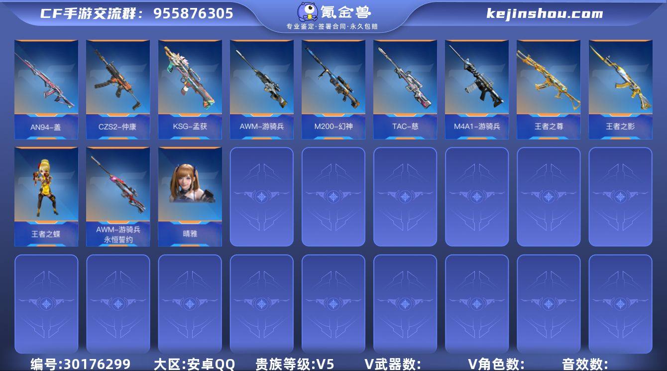 安卓Q☝贵族5☝晴雅☝AWM-游骑兵一永恒誓约+音效卡☝M4A1-游骑兵+音效卡☝AN94-盖☝王者之影☝王者之尊☝M200-幻神☝TAC-慈☝GM6-逆骨☝王者之蝶☝CZS2-仲康☝KSG-孟获☝详细见图☝