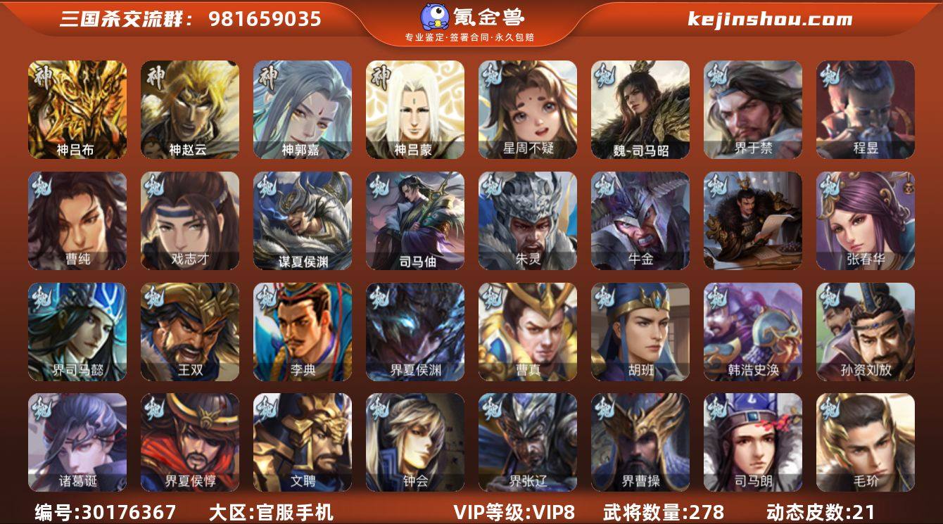 官阶:骠骑将军;VIP等级:VIP9;史诗武将数量:27;动态皮肤数量:19;武将总数:275;史诗宝珠数量:38;将魂数量:419;神将:1;魏国史诗武将:12;蜀国史诗武将:6;吴国史诗武将:5;群史诗武将:8 神吕布,杨修,马钧,界钟会,嵇康,郝昭,曹纯,戏志才,程昱,谋赵云,谋马超,沙摩柯,谯周,花鬘,谋关羽,留赞,界徐盛,界步练师,文鸯,左慈,星黄忠,苏飞,麹义,沮授,界李儒,许攸,兀突骨,神吕蒙,神周瑜,SP关羽,乐进,曹昂,诸葛诞,朱灵,文聘,SP姜维,张春华,钟会,曹冲,郭淮,满宠,界王异,界曹操,界司马懿,界夏侯惇,界张辽,界许褚,界郭嘉,李典,曹真,韩浩史涣,陈群,曹叡,钟繇,司马朗,王基,郭皇后,孙资刘放,辛宪英,界甄姬,吕虔,鲁芝,杜畿,界邓艾,界曹植,界郭淮,卞夫人,蔡贞姬,袁涣,崔琰,牵招,胡班,董昭,SP孙尚香,关银屏,夏侯霸,马良,关兴张苞,廖化,界马岱,关平,刘封,界法正,界关兴张苞,界刘备,界张飞,界赵云,SP徐庶,吴懿,周仓,张松,刘谌,夏侯氏,糜竺,马忠,李严,黄皓,界黄月英,赵统赵广,界伊籍,界庞统,界姜维,杨仪,糜夫人,界周仓,刘巴,界吴懿,彭羕,谋庞统,界张嶷,谋姜维,谋张飞,诸葛果,蒋琬费祎,甘夫人,孙茹,凌操,大乔小乔,诸葛恪,诸葛瑾,孙鲁育,程普,韩当,潘璋马忠,虞翻,界甘宁,界黄盖,界周瑜,界大乔,界陆逊,孙鲁班,朱桓,顾雍,朱治,阚泽,孙登,岑昏,界孙权,界孙尚香,孙亮,严畯,吕岱,界孙策,卫温诸葛直,界凌统,界虞翻,陈武董袭,界孙鲁班,谋韩当,谋吕蒙,谋周瑜,界孙休,界朱治,伏完,刘协,界袁术,SP赵云,张宝,伏皇后,李儒,华雄,袁术,界华佗,界吕布,公孙瓒,蔡夫人,公孙渊,郭图逢纪,张鲁,严白虎,SP黄月英,曹节,界貂蝉,李傕,界庞德,界颜良文丑,樊稠,界刘表,星张辽,星徐晃,星张郃,界公孙瓒,韩遂,界伏皇后,朱儁,谋刘赪,马日磾,王濬,谋陈宫,谋袁绍,何进,张任,李傕郭汜,神吕布-冠绝天下(动态),甄姬-明珠耀躯(动态),曹丕-气荡山河(动态),张春华-雪中舞刃(动...