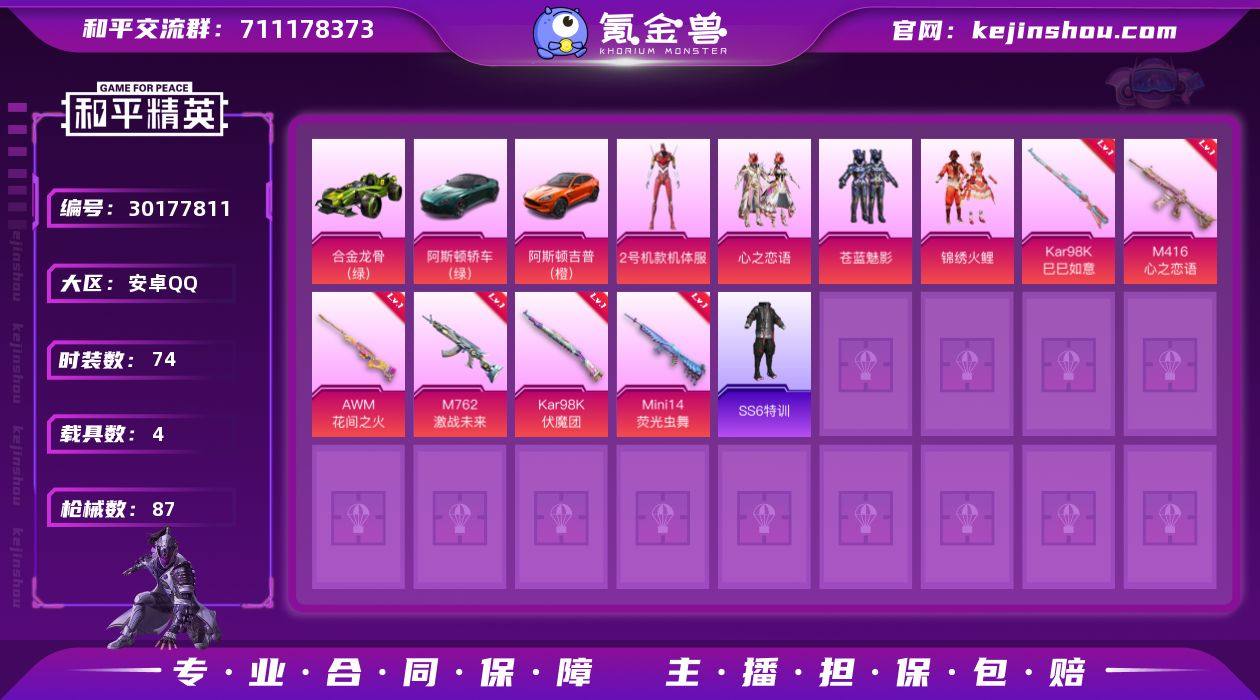 【红螳螂4载具5粉装6特效枪可秒换绑】 安卓Q区-34917热力值--73套装-87枪皮 【4载具】 阿斯顿马丁S绿色 阿斯顿马丁X橙色 合金龙骨绿色 双刃魅影红色【5粉装】 2号机款机体服 红螳螂 心之恋语 锦绣火鲤 苍蓝魅影【6特效枪】 Kar98K-伏魔团(3级) M416-心之恋语(3级) AWM-花间之火(2级) Mini14-荧光虫舞(3级) M762-激战未来(2级) Kar98K-巳巳如意(4级)【22热门】 M416-蓝色火焰 GROZA-春暖花开 M762-镭射皇者 真理款战斗服 长空猛禽 牛气冲天 明日香款战斗服 仓鼠灰灰 海洋之心 破蛋小黄鸡 M416-仓鼠灰灰 白色伏地魔 SS6特训 SS22特训 SCAR-L-玉兔迎春 Mk47-乌木金纹 UMP45-蓝色火焰 MG3-幻世战舞者 AKM-虎虎生威 AKM-霓虹街区【2飞行器】 古堡领主飞行器 霓虹街区飞行器 营地ID:732846232