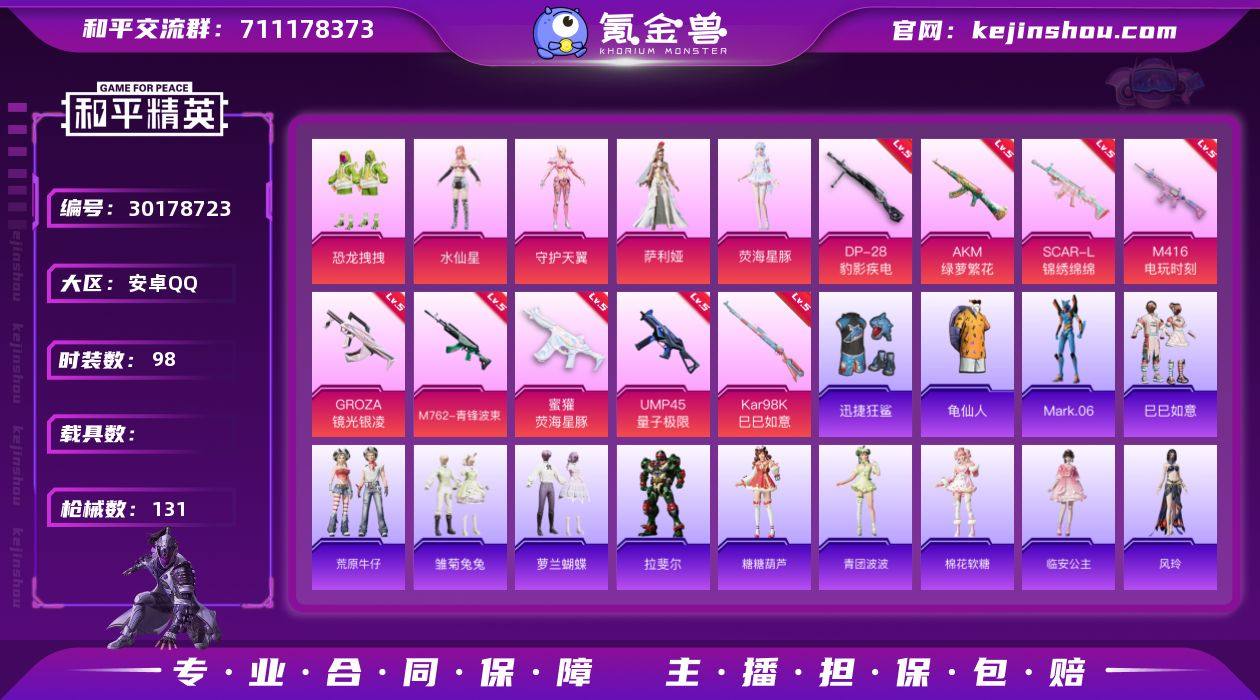 安卓 手Q-满天赋5粉装-9特效枪-0载具-1粉色飞行器-42657热力值-8王牌印记-98套装-131枪皮 【热门品类】:套装-龟仙人,角色-Mark.06 【粉色套装】:粉装-恐龙拽拽,角色-水仙星,角色-守护天翼,角色-萨利娅,角色-荧海星豚 【粉色枪皮等级】:AKM-绿萝繁花(五级),SCAR-L-锦绣绵绵(五级),M416-电玩时刻(五级),GROZA-镜光银凌(五级),M762-青锋波束(五级),蜜獾-荧海星豚(五级),UMP45-量子极限(五级),Kar98K-巳巳如意(五级),DP-28-豹影疾电(五级) 【粉色枪皮】:AKM-绿萝繁花,SCAR-L-锦绣绵绵,M416-电玩时刻,GROZA-镜光银凌,M762-青锋波束,蜜獾-荧海星豚,UMP45-量子极限,Kar98K-巳巳如意,DP-28-豹影疾电 【粉色飞行器】:英伦信使飞行器 【粉色降落伞】:至尊龙雀降落伞,未来歌姬降落伞,炫光之旅降落伞,莲影清波降落伞,星空武士降落伞,精灵梦叶罗丽降落伞,创世·救赎降落伞,初号机 觉醒Ver.降落伞,忍者神龟降落伞,拳皇·狂花道降落伞,未来领航者降落伞,临安公主降落伞 【稀有套装】:套装-龟仙人,套装-巳巳如意,套装-荒原牛仔,套装-雏菊兔兔,套装-萝兰蝴蝶,角色-拉斐尔,套装-糖糖葫芦,套装-青团波波,套装-棉花软糖,角色-临安公主,角色-风玲,套装-彩虹兔,套装-云朵鹅,套装-雪绒豹,套装-蜜露汐语,套装-蓝海鲸歌 【稀有枪皮】:AKM-霓虹街区,AKM-龙的传人,SCAR-L-是爱神辣,M416-糯团青竹,M416-蓝色火焰,GROZA-2B战斗服款,GROZA-荧海星豚,AUG-2P战斗服款,AUG-凝视深渊,AUG-耀粉歌者,QBZ-未来歌姬,M762-云朵鹅,Mk47-炫光之旅,G36C-六号树人,AC-VAL-快闪甜心,蜜獾-天降萌叽,UZI-啾咪啾咪,UZI-天降萌叽,UMP45-时空追击者,Vector-焰鹰斗篷,Vector-夜灯,Vector-生命誓言,Vector-黑色刀锋,汤姆逊-天降萌叽,汤姆逊-炫彩节奏,汤姆逊-耀粉歌者,P90-快闪甜心,P...