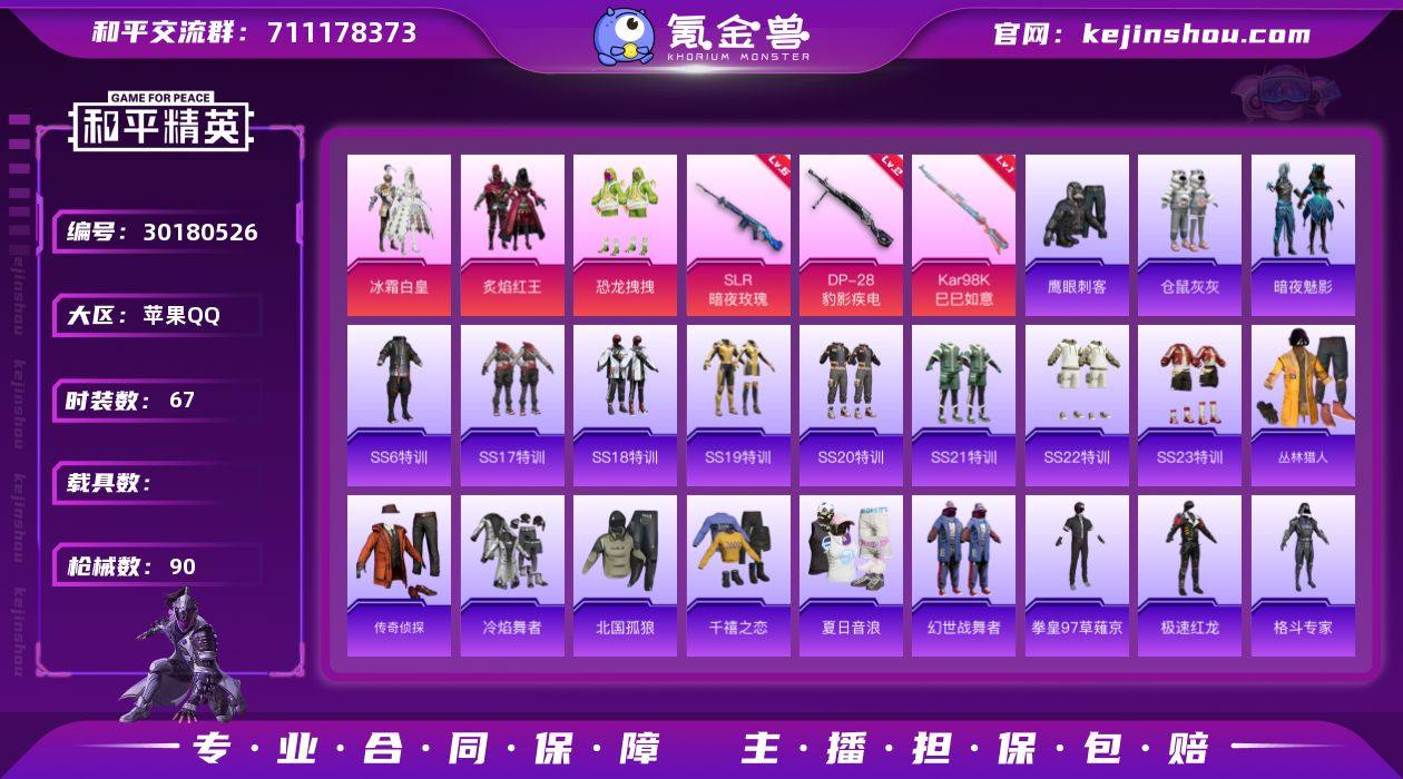 苹果 手Q-3粉装-3特效枪-0载具-0粉色飞行器-24852热力值-2王牌印记-67套装-90枪皮 【粉色套装】:粉装-冰霜白皇,粉装-炙焰红王,粉装-恐龙拽拽 【粉色枪皮等级】:Kar98K-巳巳如意(一级),SLR-暗夜玫瑰(六级),DP-28-豹影疾电(二级) 【粉色枪皮】:Kar98K-巳巳如意,SLR-暗夜玫瑰,DP-28-豹影疾电 【粉色降落伞】:至尊龙雀降落伞,春暖花开降落伞,精灵迷巫降落伞 【稀有枪皮】:AKM-彩虹符号,AKM-影袭,AKM-破晓战魂,AKM-虎虎生威,AKM-霓虹街区,M16A4-蓝色火焰,SCAR-L-玉兔迎春,SCAR-L-红色方程式,M416-暗星紫秘,M416-神秘黑猫,M416-糯团青竹,M416-红色方程式,GROZA-异彩先驱,GROZA-影袭,GROZA-恐龙拽拽,GROZA-春暖花开,GROZA-蓝莓炮弹,GROZA-黑色刀锋,AUG-耀粉歌者,QBZ-飞驰魅影,M762-拳皇97,M762-瑞龙福将,Mk47-洛神天依,AC-VAL-天降萌叽,蜜獾-垂柳戏鸭,蜜獾-娇憨猪猪,UZI-娇憨猪猪,UZI-影袭,UZI-炫彩节奏,UMP45-春暖花开,Vector-暗夜玫瑰,Vector-生命誓言,汤姆逊-异彩先驱,MP5K-异彩先驱,P90-飞驰魅影,Kar98K-彩虹符号,Kar98K-炫彩节奏,Kar98K-电玩视界,Kar98K-红色方程式,Kar98K-飞驰魅影,M24-影袭,M24-炫彩节奏,M24-仲夏莫吉托,SKS-夜灯,SKS-炫彩节奏,SKS-迅猛狂鲨,Mini14-异彩先驱,Mini14-炫彩节奏,Win94-瑞龙福将,SLR-娇憨猪猪,S686-魔法学院,S1897-炫彩节奏,S1897-飞驰魅影,S12K-瑞龙福将,S12K-童趣迷兔,S12K-娇憨猪猪,M249-拳皇97,DP-28-齐天大圣,MG3-幻世战舞者,MG3-瑞龙福将,P92-拳皇97 【其他套装】:套装-SS6特训,套装-SS17特训,套装-SS18特训,套装-SS19特训,套装-SS20特训,套装-SS21特训,套装-SS22特训,套装-SS23特训,套装-丛林猎人,套装-传奇侦探,套装-冷焰舞者,套装-北国孤狼,套装-千禧之恋,套装-夏日音浪,套装-幻...