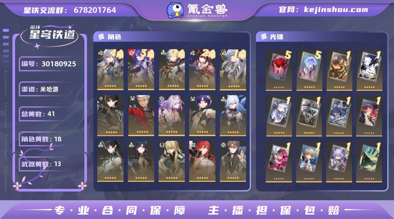 总黄数: 41 4命金色角色: 4命布洛妮娅 3命金色角色: 3命黄泉 2命金色角色: 2命花火,2命白厄 1命金色角色: 1命星期日 0命金色角色: 0命白露,0命姬子,0命瓦尔特,0命克拉拉,0命杰帕德,0命罗刹,0命刃,0命丹恒•饮月,0命镜流,0命真理医生,0命遐蝶,0命Archer,0命丹恒·腾荒 精5武器: 精5记一位星神的陨落,精5记忆永不落幕 精1武器: 精1时节不居,精1制胜的瞬间,精1以世界之名,精1银河铁道之夜,精1此身为剑,精1记忆的质料,精1星海巡航,精1行于流逝的岸,精1回到大地的飞行,精1黎明恰如此燃烧,精1理想燃烧的地狱 亮点: 带1100抽平台合作商·7万保证金顶级信誉商家 【赠永久包赔找回真赔】V633