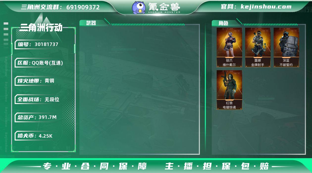总资产:391.7M 哈夫币:4.25K 烽火地带等级:60 烽火地带段位:青铜 全面战场等级:0 全面战场段位:无段位 骇爪-维什戴尔 露娜-金牌射手,深蓝-不破誓约,红狼-电锯惊魂 卖家说:废弃的手机号