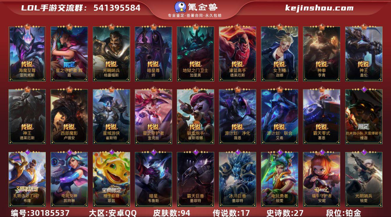 皮肤数:94 典藏皮肤数量:0 神话皮肤数量:0 传说皮肤数量:17 史诗皮肤数量:27 段位:铂金 卖家说:最高109星,刚出就在玩,多个赛季王者,160原石1000星尘,qq68级,十几年老号了,还有王者荣耀 上号看