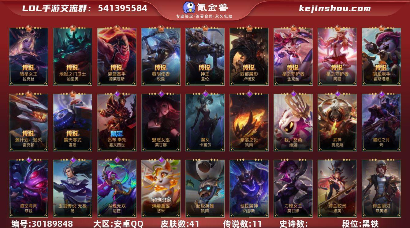 53英雄-41皮肤 【限定皮肤】:吕布 奉先 嘉文四世 【传说皮肤】:神王 盖伦,暗星女王 拉克丝,星之守护者 金克丝,星之守护者 阿狸,西部魔影 卢锡安,驯龙炮手 崔丝塔娜,灌篮高手 德莱厄斯,黎明使者 锐雯,地狱之门卫士 加里奥,源计划:泯灭 雷克顿,霸天零式 赛恩 【史诗皮肤】:烘焙童谣 悠米,腥红之月 烬,斗魂无双 尼菈,魅惑女巫 莫甘娜,武神 贾克斯,魔女 卡蜜尔,吕布 奉先 嘉文四世,奈落之炎 凯南,玉剑传说 无极 易,虚空海灵 菲兹,斗魂无双 艾瑞莉娅,我,怒角 维迦 【赛季皮肤】:s1光耀之刃,s6绯金丽刃,s8绯金鮫灵,s9王牌舰长,s10王牌上将 【其他皮肤】:小小骑士 阿木木,三昧真火 孙悟空,光耀之刃 泰达米尔,王牌舰长 崔斯特,刀锋女王 莫甘娜,绯金丽刃 菲奥娜,西部牛仔 亚索,绝命枪手 卢锡安,五连摇滚键盘手 娑娜,女警官 蔚,王牌上将 嘉文四世,超级英雄 凯南,战争血统 蒙多医生,创世魔神 内瑟斯,西部牛仔 厄运小姐,热血班长 德莱厄斯,哞利斯塔 阿利斯塔,绯金鲛灵 娜美