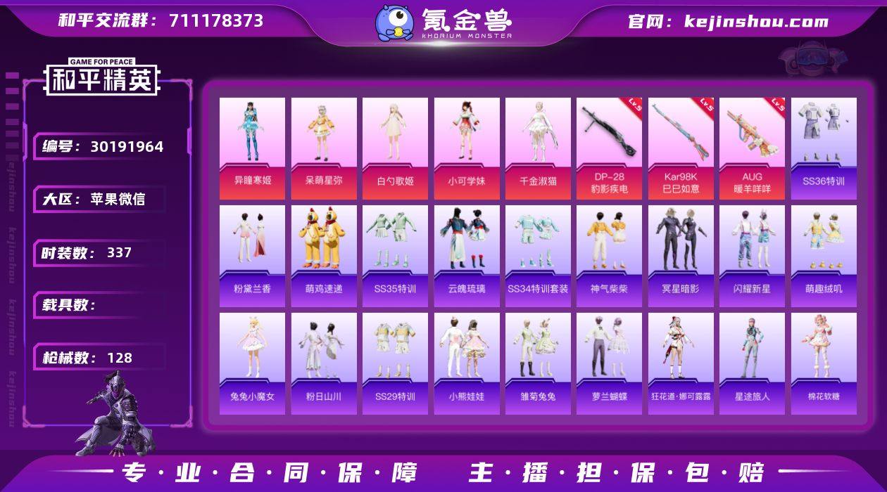 TY491-可二次-精品女号-0违规-地铁满天赋-苹果 微信-5粉装-3特效枪-0载具-1粉色飞行器-32638热力值-5王牌印记-84套装-128枪皮 【粉色套装】:角色-白勺歌姬,角色-呆萌星弥,角色-小可学妹,角色-千金淑猫,角色-异瞳寒姬 【粉色枪皮等级】:AUG-暖羊咩咩(五级),Kar98K-巳巳如意(五级),DP-28-豹影疾电(五级) 【粉色枪皮】:AUG-暖羊咩咩,Kar98K-巳巳如意,DP-28-豹影疾电 【粉色降落伞】:纯梦嫁纱降落伞,白勺歌姬降落伞,圣堂之誓降落伞,金丰海韵降落伞,拳皇·狂花道降落伞,千金淑猫降落伞,晶梦幻蝶降落伞,幻彩电音降落伞,荧海星豚降落伞 【稀有套装】:套装-绒宝小鹅,套装-巳巳如意,套装-雏菊兔兔,套装-萝兰蝴蝶,套装-小熊娃娃,角色-狂花道·娜可露露,套装-糖糖葫芦,套装-青团波波,套装-棉花软糖,套装-紫幽梦,套装-蓝冰羽,套装-极速光影,套装-云朵鹅,套装-雪绒豹,套装-蜜露汐语,套装-炫彩糖果 【稀有枪皮】:AUG-冰晶雪宝,AKM-破晓战魂,M16A4-幻世战舞者,SCAR-L-夜灯,SCAR-L-炫彩节奏,GROZA-懵萌河马,GROZA-晶梦幻蝶,AUG-天降萌叽,QBZ-璀璨巨星,M762-天降萌叽,M762-云朵鹅,Mk47-妙红点点,G36C-懵萌河马,G36C-暗夜玫瑰,UZI-啾咪啾咪,UZI-天降萌叽,UMP45-蓝色火焰,UMP45-绒宝小鹅,Vector-彩虹符号,汤姆逊-天降萌叽,汤姆逊-耀粉歌者,汤姆逊-智耀战神,AKS-74U-鬼刀,P90-巳巳如意,SKS-炫彩节奏,VSS-彩虹符号,Mk14-幻星舰长,AMR-妙红点点,AMR-白勺歌姬,SVD-云朵鹅,S686-生命誓言,S686-白勺歌姬,S686-红色方程式,,套装-神气柴柴,套装-冥星暗影,套装-闪耀新星,套装-萌趣绒叽,角色-粉雾星云,角色-兔兔小魔女,套装-粉日山川 【营地ID】:941074061