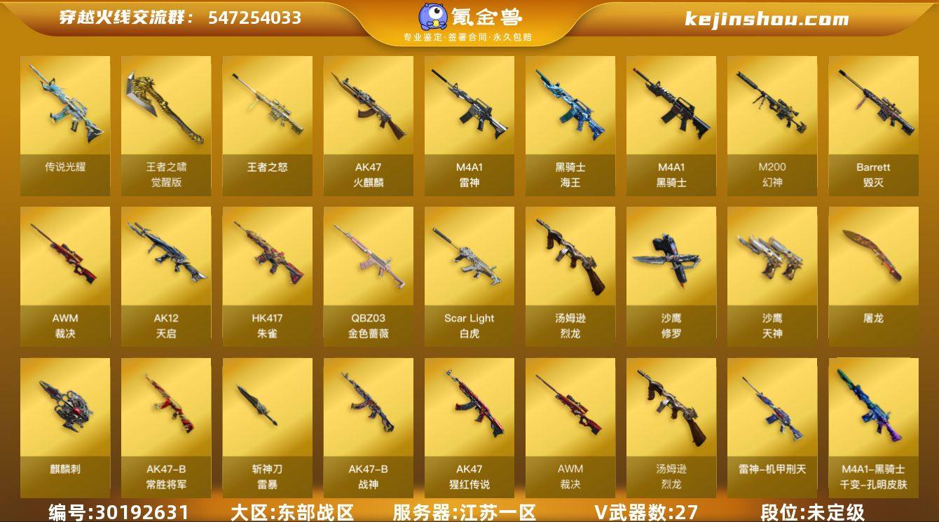 江苏一区-27V-6王者-0炫金 【传说武器】:传说光耀 【热门武器】:传说光耀,QBZ03-金色蔷薇,Scar Light-白虎,HK417-朱雀,M200-幻神,M4A1-黑骑士,汤姆逊-烈龙,沙鹰-修罗 【王者炫金武器】:王者之怒 【音效卡】:M200-幻神音效卡,M4A1-黑骑士音效卡 【皮肤】:幻神-丹凤,幻神-宠儿-2021MVP,M200-幻神-N9-2022MVP,雷神-暗月,雷神-机甲刑天皮肤,火麒麟-平天大圣,火麒麟-荣耀世冠AG,火麒麟-百城,火麒麟-心动糖果,M4A1-千变-孔明皮肤,战神-粉色甜心皮肤*2,战神-紫绶金章皮肤*3,战神-流金岁月皮肤*3,AK47-B-常胜将军-曹操*3,AK47-B-常胜将军-刘备*2,AK47-B-常胜将军-孙权,AWM-天龙-传奇70KG 【角色】:王者玲珑-小乔,炽天使,暗夜-X,初恋灵狐,风暴女*2,嘉年华灵狐,娟娟,灵狐-花神,曼陀罗-礼服,女战神,潘多拉-X,斯沃特-X,铁骑荣耀,雪莉杨-摸金校尉,樱-战斗天使 【人偶武器】:迷你深渊冰龙,迷你牛魔王,迷你波特博士*3,迷你牛牛,深渊终结者手雷,闪光弹-小乔,闪光弹-貂蝉,高爆手雷-大乔,迷你超能女侍 【挑战大师】:神圣爆裂者III,冰龙粉碎者-白马银枪,激光毁灭者III-白马银枪*3,激光毁灭者III 【英雄级武器】:AK47-火麒麟*2,M4A1-雷神*2,M4A1-黑骑士,AK12-天启,HK417-朱雀,Scar Light-白虎,QBZ03-金色蔷薇,AK-47-猩红传说,AK47-B-战神,王者冰魄-觉醒版,黑骑士-海王*2,AK47-B-常胜将军,Barrett-毁灭*2,AWM-裁决*2,M200-幻神,王者之怒-觉醒版,汤姆逊-烈龙,沙鹰-修罗,沙鹰-天神,屠龙,麒麟刺,斩神刀-雷暴,王者之啸-觉醒版 【道具】:超级背包,夺命之镰,防化服,金色流光-枪王排位*2,星辰流光-枪王排位,巅峰赛先锋-金色流光,枪王排位28赛季金色流光,枪王排位29赛季金色流光,电玩兔兔表情,EP战队名片,EP战队喷图,防弹头盔*4,防弹衣*4,C4工...