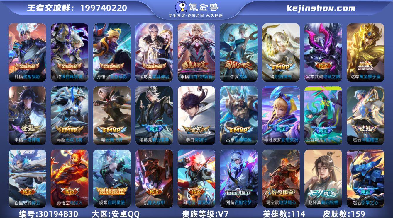【15】安卓Q-V7-尊贵铂金I段位-114英雄-159皮肤-4典藏皮肤-19传说-49史诗 【英雄全皮】:李信全皮 【荣耀典藏】:孙悟空全息碎影,诸葛亮星域神启,铠银白咏叹调,韩信弑枪猎影 【传说皮肤】:上官婉儿妄想奇谈,马可波罗妄想实况,诸葛亮鹤羽星尊,澜电玩雷克斯,李信山海炽霜斩,吕布怒海麟威,李白诗剑行,百里守约碎云,马超无双飞将,赵云淬星耀世,铠绛天战甲,镜炽阳神光,虞姬启明星使,曜云鹰飞将,李信一念神魔,伽罗太华,达摩黄金狮子座,宫本武藏地狱之眼,孙悟空地狱火 【限定皮肤】:狄仁杰阴阳师,赵云皇家上将,赵云引擎之心,元歌无心,马可波罗妄想实况,狄仁杰魔术师,项羽海滩派对,韩信飞衡,孙悟空美猴王,刘备百相守梦,李元芳云中旅人,虞姬启明星使,鬼谷子五谷丰年,诸葛亮鹤羽星尊,裴擒虎擒涛扼浪,狂铁电玩高手,云中君纤云弄巧,李信山海炽霜斩,伽罗太华,上官婉儿妄想奇谈,嫦娥拒霜思,嫦娥暖冬兔眠,西施玲珑珍味,鲁班大师探海日志,桑启海盐诗旅,暃星界游侠,戈娅驭风魔法,艾琳流音漫舞,赵怀真鹤归松栖,司空震地狱燃心,张良古海寻踪,蒙犽百解令,鬼谷子天穹祈灯,沈梦溪龙舞盛年 【年限皮肤】:孙悟空美猴王,伽罗太华,韩信飞衡,李信山海炽霜斩 【赛季限定】:张良古海寻踪,李元芳云中旅人,裴擒虎擒涛扼浪,鲁班大师探海日志,桑启海盐诗旅,鬼谷子天穹祈灯 【战令限定】:艾琳流音漫舞,狂铁电玩高手,嫦娥暖冬兔眠,西施玲珑珍味,司空震地狱燃心,暃星界游侠,戈娅驭风魔法 【史诗皮肤】:鲁班七号电玩小子,赵云皇家上将,赵云未来纪元,甄姬冰雪圆舞曲,王昭君偶像歌手,狄仁杰魔术师,廉颇地狱岩魂,宫本武藏鬼剑武藏,孙尚香水果甜心,嬴政暗夜贵公子,墨子金属风暴,曹操幽灵船长,李白千年之狐,韩信白龙吟,赵云引擎之心,花木兰水晶猎龙者,刘邦德古拉...