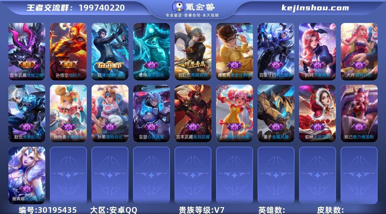 贵族6/皮肤227/典藏1/传说4/史诗66/英雄126/刘禅全皮/戈娅全皮/空空儿全皮/全息碎影/愿照·九州拓/鸣野蒿/末日机甲-孙尚香/地狱之眼/蒙犽顽岩魄/天穹之誓(s36)/阴阳师/皇家上将/蔷薇恋人/奇幻香踪/猎兽之王/无心/魔术师/海滩派对/金庭之子(s27)/匿光侦查者/云中旅人(s29)/遇见飞天/五谷丰年/原初追遂者/大漠名商(s28)/李小龙/擒涛扼浪(s31)/纤云弄巧/拒霜思/玲珑珍味/探海日志(s32)/海盐诗旅(s30)/驭风魔法/流音漫舞/地狱燃心/江河有灵/古海寻踪(s33)/百解令(蒙犽)/蒙恬荣光圣徽/高渐离燃音魔法/妲己灵卜魔法/鬼谷子天穹祈灯(S34)/琥珀纪元伽罗/龙武盛年/蔬乡物语(鲁班七号)/蔬乡物语(李元芳)/剑破天穹(s35)/程咬金群星魔术团/青焰无极/苍威无极/熔金海岸/噬灭天穹(s37)/谧流熔炉/虚灵犬护/逆浪荇歌/荣光之誓/星界战将/九幽镇关/百相守梦-百里守约/百相守梦-老夫子/鸭鸭历险记-刘禅/鸭鸭历险记-沈梦溪/百相守梦-周瑜/百相守梦-孙策/线条小狗-周瑜/紫霞仙子/未来纪元-赵云/圣诞恋歌/冰雪圆舞曲/地狱岩魂/鬼剑武藏/水果甜心/金属风暴/圣诞狂欢/绅士熊喵/幽灵船长/末日机甲-吕布/乱世虎臣/水晶猎龙者/德古拉伯爵/乘风破浪/暗隐猎兽者/黄金分割率/心灵战警/冰冠公主/心灵骇客/曙光守护者/舞动绿茵/天才门将/逐浪之夏/功夫厨神/星夜王子/节奏热浪/猫狗日记-孙策/鹰眼统帅/时之恋人-孙尚香/赏金猎手/电玩·爆裂旋风/万物之道/器灵·浮梦炉/化蝶舞/龙之律动/百相守梦-黄忠/罗小黑战记/教廷特使/街头霸王/哥特玫瑰/大发明家/白执事/忍·炎影/红桃皇后/白色死神/东方不败/化身博士/救世之瞳/未来纪元-宫本武藏/玩偶对对碰/少女阿狸/黄金武士/死亡骑士/拳王/兔女郎/五福同心/花好人间/万事如意/万象初新/纽约教父/汉昭烈帝/龙腾万里/进击墨子号/海滩丽影/幻想奇妙夜/命运角斗场/功夫老勺/沉稳之力/掌控之力/坚韧之力/虹云星官/鲨...