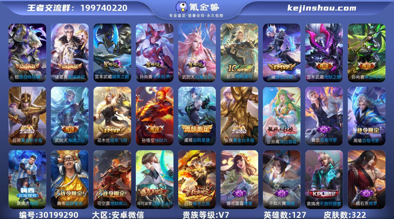 贵族等级:V7 典藏皮肤数:2 珍品无双皮肤数:0 无双皮肤数:0 珍品传说皮肤数:0 传说皮肤数:10 史诗皮肤数:89 皮肤数:322 英雄数:127 段位:无双王者 卖家说:双1.5国50高胜率老虎澜,带有小魔方