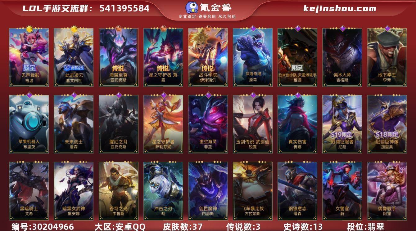 皮肤数:37 典藏皮肤数量:0 神话皮肤数量:1 传说皮肤数量:3 史诗皮肤数量:13 段位:翡翠 卖家说:可以刀