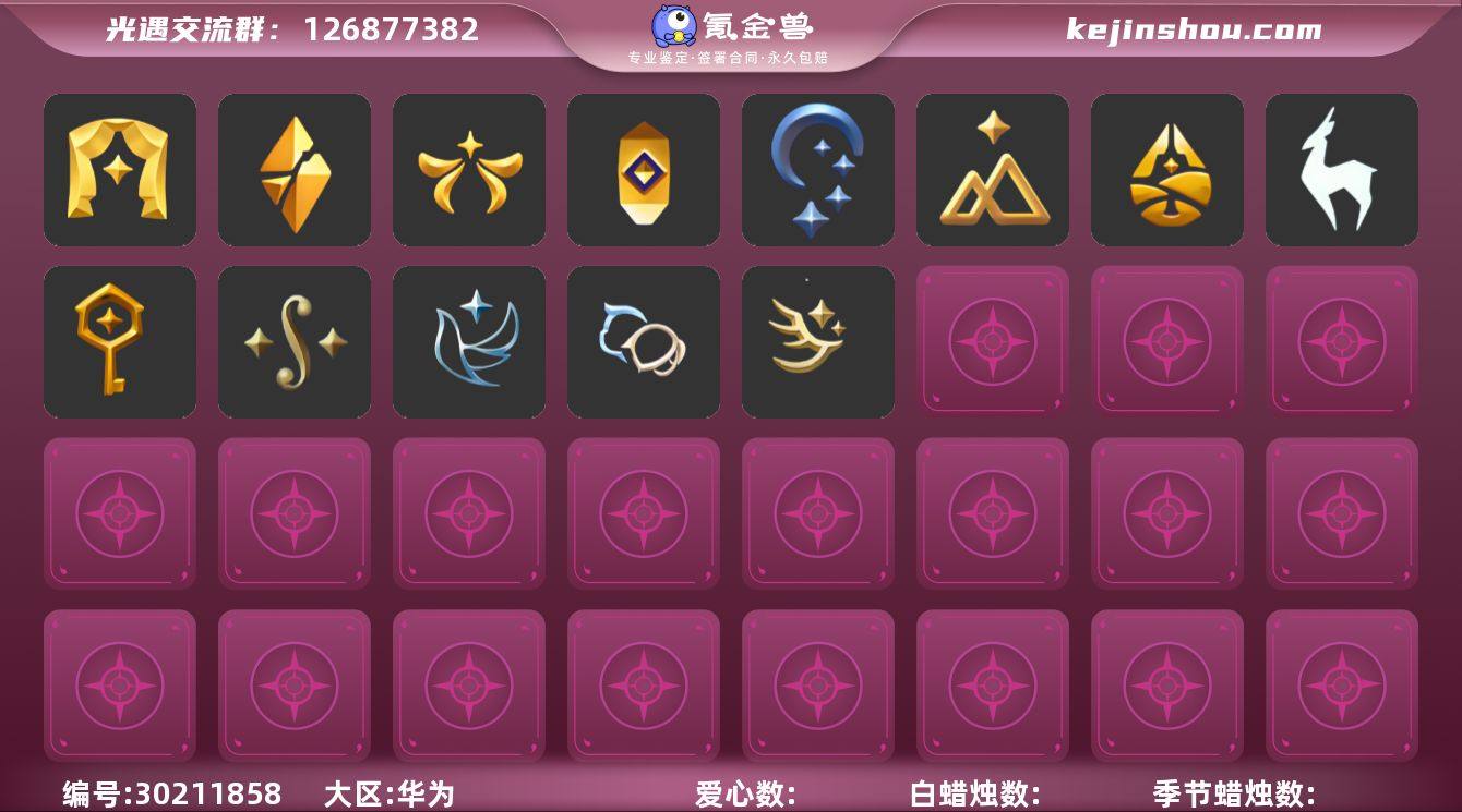 iOS官服 手机账号 2珍稀物品 10毕业季 4毕业图 1847蜡烛 【珍稀物品】周年电吉他,彩虹围巾(五塑彩带斗) 【季节已毕业】青鸟季,双星季,夜行季,拾光季,归巢季,九色鹿(九色鹿季),筑巢季,二重奏季,姆明季,彩染季 【完成地图】云野,雨林,霞谷,墓土(暮土) 【礼包】青衫落拓礼包,海牛玩偶礼包,兔子鞋(兔子拖鞋),史力奇套装,新年裤(瑞气服饰),蝴蝶结(大蝴蝶结),水母(水母肩饰),向日葵套(夏日有友礼包),海蓝波浪发型(海洋发型),巫师(巫师帽),橘子(大橘大利),贝壳(贝壳发饰),兔子(玉兔头饰)(玉兔发饰)(兔子发饰),大耳狗发饰(迷你大耳狗发饰),心心相印发饰礼包,四叶草(四叶草头饰),九色鹿角(神鹿祝福头饰)(神鹿祝福礼包),新年耳钉(金鳞耳饰),彩虹耳钉(彩虹耳饰),枯角(巫树犄角),鹿角(圣诞鹿角),围巾(小王子斗篷)(小王子围巾),欧若拉之翼,福娃(福娃礼包)(春之日礼包)(铜钱斗),透明蛛丝(透明蜘蛛斗),电吉他(周年电吉他),荷叶伞,献瑞折扇礼包,茶桌(花憩茶桌),茶壶(小憩茶桌),小狐狸(狐狸背包),猫背饰(猫咪背饰),大铁头 【裤子】筑巢季·裤子(设计师长袍),妮妮裙子(妮妮长裙),武士裤,背带裤,搓澡巾,击剑裤 【面具】夜行毕业面具(棕熊面具),辉光羚羊面具 【面饰】黑框眼镜(粗框眼镜),青鸟毕业面饰(青鸟面饰),红耳机 【发型】飞天盘发(九色鹿丸子头),虚荣,归巢毕业发型(五塑彩羽发),若笠(箬笠) 【头饰】平顶帽,蓝色音乐会(蓝色音乐符),牛仔帽(西部帽) 【斗篷】粉红绒毛斗篷(绒毛斗篷),青鸟毕业斗篷(青鸟斗篷),彩染围巾斗篷,绿芽,海洋斗 【配饰】相机(季卡相机),小红伞(姆明红伞)(姆明大伞),姆明抱枕,雨伞,筑巢季·小手办(光之子试衣),高音钢琴(白色高脚钢琴)