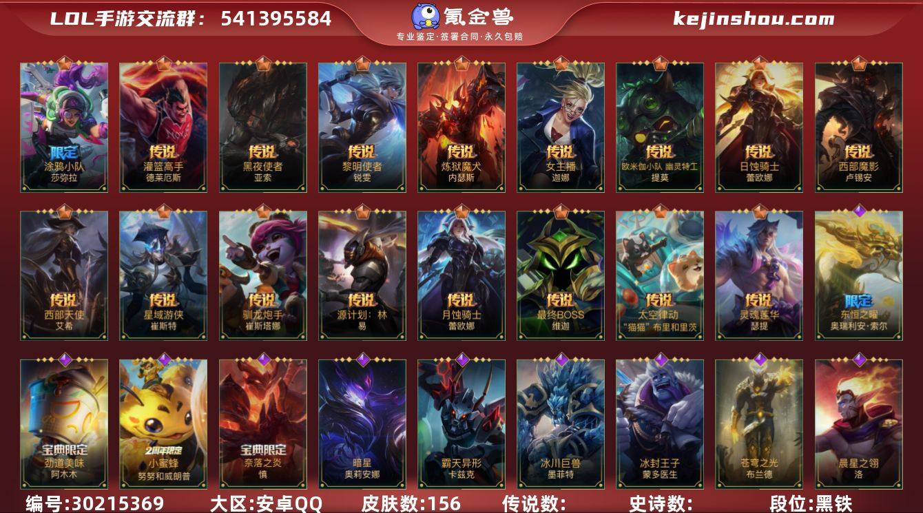 安卓QQ无二次 127英雄-156皮肤 【限定皮肤】:涂鸦小队 莎弥拉 【传说皮肤】:星域游侠 崔斯特,太空律动 “猫猫”布里和里茨 布里茨,黑夜使者 亚索,西部魔影 卢锡安,日蚀骑士 蕾欧娜,月蚀骑士 蕾欧娜,驯龙炮手 崔丝塔娜,欧米伽小队 幽灵特工 提莫,炼狱魔犬 内瑟斯,灵魂莲华 瑟提,源计划:林 易,灌篮高手 德莱厄斯,女主播 迦娜,西部天使 艾希,黎明使者 锐雯,涂鸦小队 莎弥拉,最终BOSS 维迦 【史诗皮肤】:钢铁军团 盖伦,腥红之月 亚托克斯,星之守护者 拉克丝,劲道美味 阿木木,黎明使者 卡尔玛,小蜜蜂 努努和威朗普,地狱行者 孙悟空,暗星 奥莉安娜,光明哨兵 黛安娜,霸天异形 卡兹克,清剿小队 金克丝,双城之战:天资 金克丝,烘焙童谣 悠米,圣诞老人 布隆,东恒之曜 奥瑞利安·索尔,铁血女忍 阿卡丽,源计划:暗影 阿卡丽,银河魔装机神 安妮,K/DA ALL OUT 阿狸,屠龙勇士 凯尔,我,羽饰骑士 崔丝塔娜,小蜜蜂 提莫,驯龙女巫 璐璐,炼狱魔女 蔚,晨星之翎 洛,太空律动 “百万调音” 格温,地下拳王 李青,柯基 库奇,奈落之炎 凯南,冰封王子 蒙多医生,灵魂莲华 永恩,泳池派对 格雷福斯,魅惑女巫 迦娜,神龙尊者 苍龙 艾希,福牛守护者 阿利斯塔,冰川巨兽 墨菲特,暗星 墨菲特,绒毛 菲兹,电玩勇者 锐雯,玉剑传说 舞剑仙 艾瑞莉娅,猎龙勇士 奥拉夫,奈落之炎 慎,苍穹之光 布兰德,灵魂烈焰 布兰德,泳池派对 雷克顿,黯晶巨鳄 雷克顿,盗梦暗影 锤石,宇航员 诺提勒斯 【赛季皮肤】:s1光耀之刃,s2光耀之芒,s4光耀之心,s5绯金魅影,s6绯金丽刃,s7绯金战斧,s8绯金鮫灵,s9王牌舰长,s10王牌上将,S11王牌勇将,s11王牌司令,s12龙冕先锋,s13龙冕御盾,s14龙冕神策,s15龙冕异士,s16冠翎飞行员,s17冠翎御风使 【其他皮肤】:小小骑士 阿木木,暗黑武士 雷恩加尔,光明骑士...