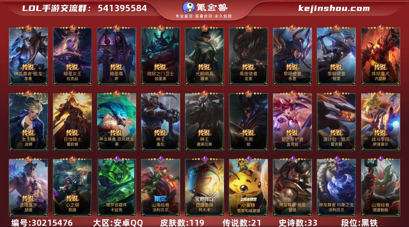 125英雄-119皮肤 【限定皮肤】:山海绘卷 诺提勒斯,山海绘卷 沃利贝尔 【传说皮肤】:神王 盖伦,暗星女王 拉克丝,心之钢 凯隐,光明哨兵 薇恩,星之守护者 金克丝,暗星尊 烬,源计划:超体 莫德凯撒,黑夜使者 亚索,天煞 劫,日蚀骑士 蕾欧娜,神龙尊者 圣龙 李青,炼狱魔犬 内瑟斯,灵魂莲华 瑟提,黎明使者 永恩,神龙尊者 驭风啸龙 易,神王 德莱厄斯,女主播 迦娜,黎明使者 锐雯,战斗学院 伊泽瑞尔,地狱之门卫士 加里奥,源计划:泯灭 雷克顿 【史诗皮肤】:钢铁军团 盖伦,霸天剑魔 亚托克斯,劲道美味 阿木木,雷喵喵尔 雷恩加尔,小蜜蜂 努努和威朗普,猎梦吞噬者 卡兹克,末路管家 布隆,猛虎 布隆,灰烬领主 奥瑞利安·索尔,腥红之月 崔斯特,电玩女神 卡莎,斗魂无双 尼菈,K/DA ALL OUT 阿卡丽,源计划:雷 卢锡安,我,羽饰骑士 崔丝塔娜,小蜜蜂 提莫,暗星 嘉文四世,福牛守护者 嘉文四世,山海绘卷 沃利贝尔,神龙尊者 均衡之龙 沃利贝尔,地下拳王 李青,魅惑女巫 厄运小姐,神龙尊者 炎龙 瑟提,玉剑传说 无极 易,灵魂莲华 易,冰川巨兽 墨菲特,暗星 墨菲特,暗星 韦鲁斯,西部魔影 执行人 卡特琳娜,真实伤害 赛娜,怨之砂 派克,山海绘卷 诺提勒斯,灵魂莲华 莉莉娅 【赛季皮肤】:s1光耀之刃,s5绯金魅影,s6绯金丽刃,s7绯金战斧,s8绯金鮫灵,s9王牌舰长,s10王牌上将,S11王牌勇将,s11王牌司令,s12龙冕先锋,s13龙冕御盾,s14龙冕神策,s15龙冕异士,s16冠翎飞行员,s17冠翎御风使 【其他皮肤】:小小骑士 阿木木,暗黑武士 雷恩加尔,三昧真火 孙悟空,斗战胜佛 孙悟空,苍穹之光 薇恩,时之砂 艾克,暗黑女武神 黛安娜,光耀之刃 泰达米尔,龙冕先锋 赵信,死亡绽放 卡兹克,龙冕御盾 布隆,龙冕异士 烬,探戈灵魂 崔斯特,王牌舰长 崔斯特,刀锋女王 莫甘娜,绯金魅影 伊芙...
