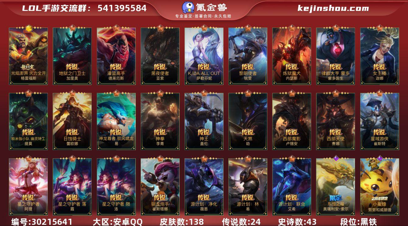 128英雄-138皮肤 【神话皮肤】:火焰澎湃 火力全开 格雷福斯 【限定皮肤】:冬季仙境 奥莉安娜 【传说皮肤】:神王 盖伦,源计划:净化 薇恩,星域游侠 崔斯特,K/DA ALL OUT 萨勒芬妮,黑夜使者 亚索,星之守护者 阿狸,天煞 劫,西部魔影 卢锡安,日蚀骑士 蕾欧娜,驯龙炮手 崔丝塔娜,欧米伽小队 幽灵特工 提莫,星之守护者 落 霞,星之守护者 陨 洛,神拳 李青,律政大亨 蒙多医生,炼狱魔犬 内瑟斯,源计划:林 易,神龙尊者 驭风啸龙 易,灌篮高手 德莱厄斯,女主播 迦娜,源计划:联合 艾希,黎明使者 锐雯,地狱之门卫士 加里奥,西部天使 赛娜 【史诗皮肤】:霸天剑魔 亚托克斯,星之守护者 拉克丝,雷喵喵尔 雷恩加尔,丧尸 努努和威朗普,小蜜蜂 努努和威朗普,探梦奇旅 艾克,恶魔之刃 泰达米尔,斗魂无双 赵信,猛虎 布隆,圣龙 奥瑞利安·索尔,东恒之曜 奥瑞利安·索尔,清剿小队 潘森,未来战士 潘森,K/DA ALL OUT 阿卡丽,源计划:火 菲奥娜,福牛守护者 菲奥娜,战场之王 布里茨,福牛守护者 安妮,源计划:阴 劫,屠龙勇士 凯尔,我,羽饰骑士 崔丝塔娜,源代码 卡蜜尔,福牛守护者 嘉文四世,奈落之炎 凯南,灵魂莲华 永恩,福牛守护者 德莱厄斯,魅惑女巫 迦娜,破败军团 德莱文,霸天巨兽 墨菲特,冰川巨兽 墨菲特,暗星 墨菲特,柚子软糖 菲兹,电玩勇者 锐雯,玉剑传说 舞剑仙 艾瑞莉娅,西部天使 艾瑞莉娅,霸天战鹰 加里奥,猎龙勇士 奥拉夫,奈落之炎 慎,黯晶巨鳄 雷克顿,冰糖葫芦 维迦,西部魔影 锤石,古神 沃里克,宇航员 诺提勒斯 【赛季皮肤】:s1光耀之刃,s2光耀之芒,s3光耀之灵,s4光耀之心,s5绯金魅影,s6绯金丽刃,s7绯金战斧,s8绯金鮫灵,s9王牌舰长,s10王牌上将,S11王牌勇将,s11王牌司令,s12龙冕先锋,s13龙冕御盾,s14龙冕神策,s16冠翎飞行员,s17冠翎御风使 【...