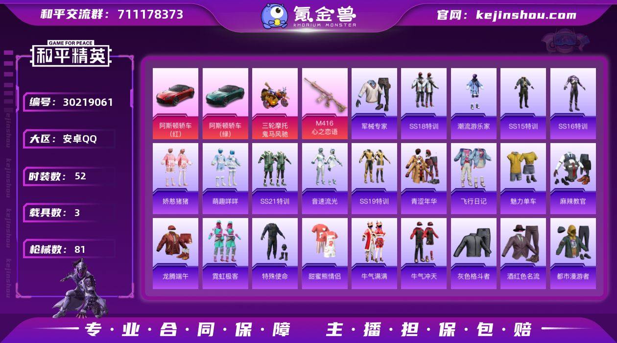 可改实名 3载具 1特效枪 52套装 81枪械 阿斯顿·马丁DBS(绿) 阿斯顿·马丁DBS(红) 鬼马风驰 M416-心之恋语[6级] 战术大师 魅力单车 麻辣教官 娇憨猪猪 玉兔迎春 萌趣咩咩 SS19特训音速流光 霓虹极客 SS16特训 萌黄之夏 王牌印记2 热力值26684 K28693 和平精英买号永久包赔带二次营地ID:741943108