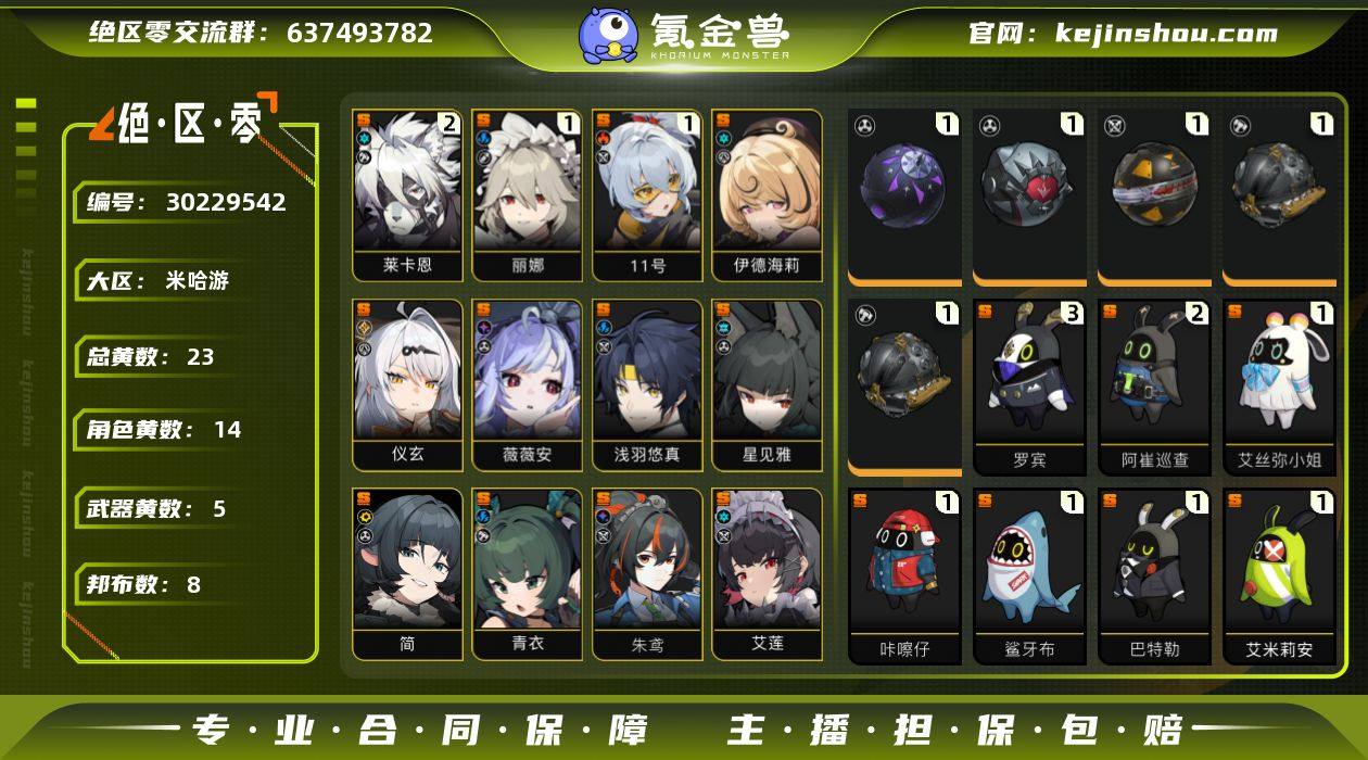 冒险等级:57 总黄数:23 菲林底片数量:72 菲林数量:10147 加密母带数量:0 五星角色数:14 2命莱卡恩,1命丽娜,1命「11号」,0命伊德海莉,0命仪玄,0命薇薇安,0命浅羽悠真,0命星见雅,0命简,0命青衣,0命朱鸢,0命艾莲,0命猫又,0命格莉丝 五星武器数:5 1精飞鸟星梦,1精淬锋钳刺,1精硫磺石,1精拘缚者 邦布数量:8 3精罗宾,2精阿崔巡查,1精艾丝弥小姐,1精咔嚓仔,1精鲨牙布,1精巴特勒,1精艾米莉安,1精左轮布 卖家说:极速出,价格可以小刀,急需用钱
