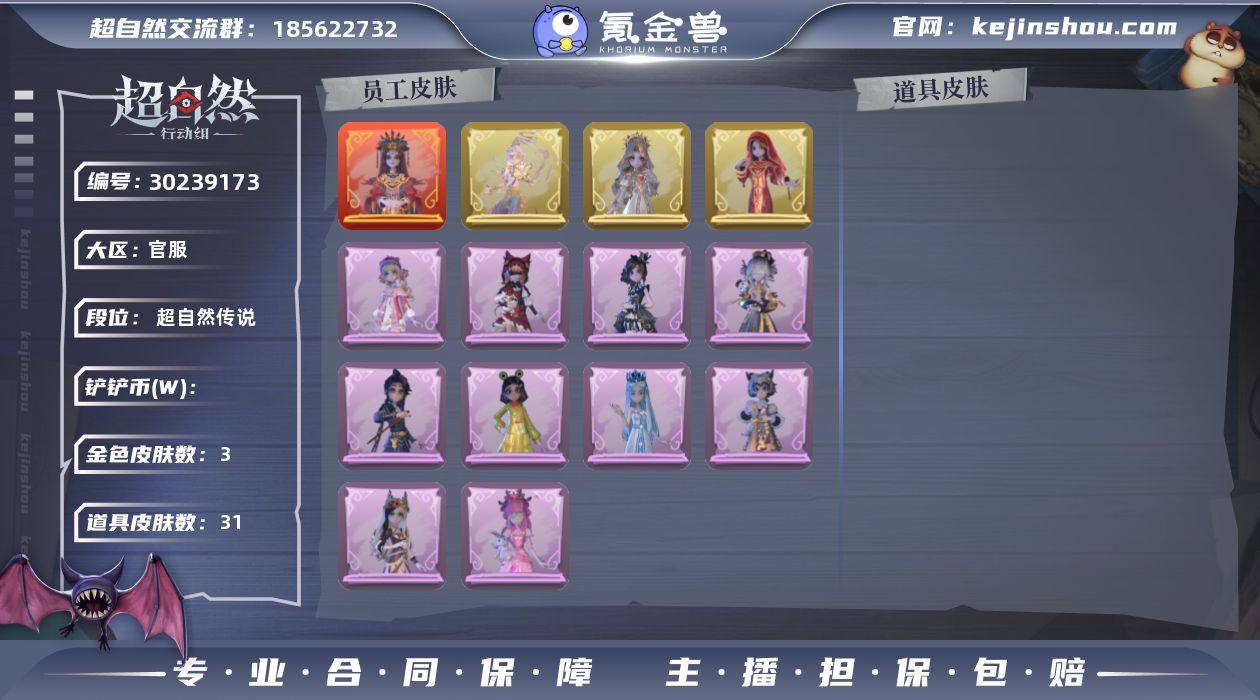 PB53 CRGM5C 号 【段位】超自然传说 【幻梦皮肤数量】1 【金色皮肤数量】3 【紫色皮肤数量】10 【道具皮肤数量】31 【累充】33960金砖 【赛季魔盒】稀世豪华魔盒 【员工】小黄、爱丽丝、零、阿念、逍遥、薇薇安、巫铃儿、莉莉、艾伦、爱德华、兰 【幻梦皮肤】巫铃儿-镜生遗梦 【金色皮肤】逍遥-莲华渡、薇薇安-圣光之谕、巫铃儿-镜花辞 【紫色皮肤】爱丽丝-甜梦派对、莉莉-莓果陷阱、小黄-异色序曲、莉莉-除妖小师妹、莉莉-情公主、爱丽丝-冰公主、薇薇安-白光莹、小黄-霓裳踏雪、逍遥-绣春逍影、小黄-呱呱雨衣 【道具皮肤】长鞭-飞天绫、长枪-荆棘、除颤仪-弦外之音、短管猎枪-赞萌露比水枪、腰包-绯红柴郡猫、摸金符-紫霄、刺刀-碧络琅环、黄牛能量饮料-青玉抱丹、音响-鸣沙鼓、急救包-蔷薇物语、喷气背包-乘风溯雪、电击枪-甜蜜泡泡枪、铲子-龙鳞、夜视仪-金丝眼镜、音响-happy猫、传送按钮-昆仑镜、葫芦-伏妖塔、额外的背包-飞花令、铲子-圣心之泪、腰包-月下莲台、长鞭-小狗蛇点点鞭、腰包-宝剑八、腰包-惊魂娃娃、摸金符-祝祷词、转轮手枪-新星时代、桃木剑-凤鸣九天、刺刀-紫气东来、黄牛能量饮料-珍珠芭乐莓莓、背饰-潮汐小海兔、背饰-梵音莲华、背饰-天使的呼唤 【美妆】暗夜小恶魔 【载具】惊奇万圣涂装 【头饰】樱桃奶油布丁、惊魂南瓜头套、精致露比头套、小财神豚豚头套、鱼头怪头套、烈焰红唇头套、大葱明头套、火爆了头套、面具马头套、哈士奇头套、萨卡班甲鱼头套、嘻嘻头套、滑稽头套、呆滞头套、卑微头套、驼半仙头套、小狗蛇点点头套、粽小宝头套、像素朋克墨镜、后室幸存者头套 【挂饰】九色祥鹿、小小玛丽、天使消失的年代、钗头凤、糖果守卫 【动作】知世摇、luvaboy、鸳鸯戏、鹏友摇、心跳摇、舞台中心、敲门舞、带你逃跑吧、举牌、抬手、KT猫摇