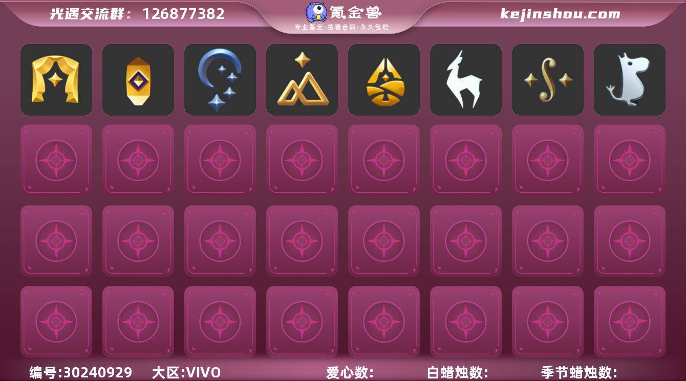 安卓官服 手机账号 1珍稀物品 9毕业季 6毕业图 251蜡烛 【珍稀物品】彩虹围巾(五塑彩带斗) 【季节已毕业】迁徙季,青鸟季,双星季,归巢季,九色鹿(九色鹿季),筑巢季,二重奏季,姆明季,彩染季 【完成地图】晨岛,云野,雨林,霞谷,墓土(暮土),禁阁 【礼包】青衫落拓礼包,周年影院套餐礼包,线框斗篷礼包(周年线框斗篷),活力海牛礼包,海牛玩偶礼包,兔子鞋(兔子拖鞋),运动鞋(跃动跑鞋),暗彩装扮(彩虹武士裤),姆明饰品套装(姆明尾巴),海蓝波浪发型(海洋发型),巫师(巫师帽),橘子(大橘大利),奥利奥(周年庆抱枕),兔子(玉兔头饰)(玉兔发饰)(兔子发饰),大耳狗发饰(迷你大耳狗发饰),心心相印发饰礼包,四叶草(四叶草头饰),星月头饰(星月头冠),九色鹿角(神鹿祝福头饰)(神鹿祝福礼包),新年耳钉(金鳞耳饰),彩虹耳钉(彩虹耳饰),彩虹耳机,日光耳环,围巾(小王子斗篷)(小王子围巾),欧若拉之翼,莲花斗(异彩莲花斗篷),蝙蝠套(蝙蝠斗篷)(南瓜头),透明蛛丝(透明蜘蛛斗),白绒金(白雪斗篷),衔福献瑞礼包(衔福献瑞斗篷),吉他(音韵吉他)(白吉他),献瑞折扇礼包,飞鸟纸伞,小狐狸(狐狸背包),小狗周年发饰(小狗周年头饰) 【裤子】筑巢季·裤子(设计师长袍),青鸟尊贵蓬头裤子(蓝色燕尾服),飞天裤(柔缎花边连)(九色鹿丝带裤),妮妮裙子(妮妮长裙),武士裤,击剑裤 【面具】辉光羚羊面具 【面饰】青鸟毕业面饰(青鸟面饰),红耳机 【发型】海蓝波浪发型,飞天盘发(九色鹿丸子头),虚荣,归巢毕业发型(五塑彩羽发),若笠(箬笠) 【头饰】平顶帽,蓝色音乐会(蓝色音乐符) 【斗篷】青鸟毕业斗篷(青鸟斗篷),彩染围巾斗篷,绿芽,海洋斗 【配饰】小红伞(姆明红伞)(姆明大伞),姆明抱枕,二重奏挂画(合奏挂画),雨伞,筑巢季·小手办(光之子试衣),高音钢琴(白色高脚钢琴)