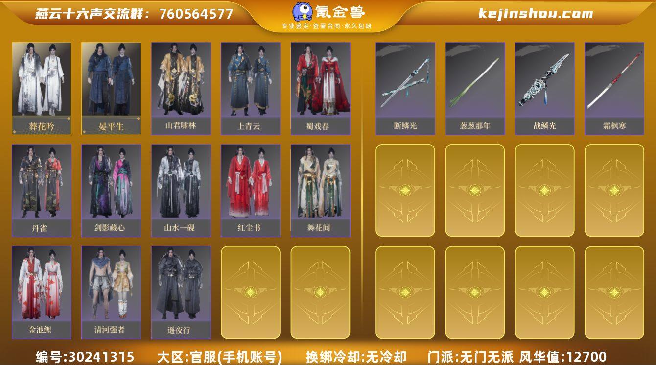 已用两个八音窍 有剑影藏心 宴平生 葬花吟 蜀戏春 发型有浮岚 武学特效有:万剑归宗 奇术特效:寒鸦渡影 战力:3鹅