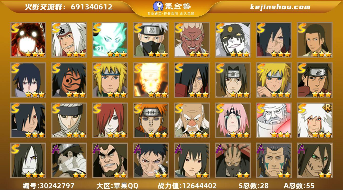IOS/28S忍/55A忍/战力1264W/V12/区服756 【S忍者】 宇智波斑「五影会谈」 ,艾「忍界大战」,大筒木桃式,宇智波斑「秽土转生·解」,千手柱间「木叶创立」,宇智波佐助「永恒万花筒」,神秘面具男「红夜之刃」,春野樱「忍界大战」,大筒木金式,漩涡鸣人「九喇嘛连结」,大野木「忍界大战」,宇智波斑「木叶创立」,自来也「舞之豪杰」,旗木卡卡西「须佐能乎」,大筒木舍人「最终章」,自来也「传说中的三忍」,漩涡鸣人「暴怒·第六尾」,宇智波斑「秽土转生」,波风水门「秽土转生」,无「二代目土影」,长门「秽土转生」,千手柱间,宇智波鼬「须佐能乎」,佩恩「天道」,波风水门,大蛇丸,波风水门「九喇嘛连结」, 【A忍者】 长十郎「六代目水影」,日向宁次「忍界大战」,漩涡博人「桃式显现」,宇智波鼬「夏日限定」,日向雏田「最终章」,旗木卡卡西「幻之真容」,小南「漂泊浪客」,李洛克「忍界大战」,不动,蝎「绯流琥」,宇智波泉奈,宇智波带土「漂泊浪客」,神农「羁绊」,桃地再不斩「秽土转生」,角都「秽土转生」,宇智波止水,长门「青年」,佩恩·六道「漂泊浪客」,艾「青年」,不风,波风水门「青年」,宇智波佐助「须佐能乎」,桃地再不斩「漂泊武士」,迪达拉「秽土转生」,漩涡鸣人「九尾查克拉」,千代「近松十人卫」,药师兜「半蛇斗篷」,我爱罗「忍界大战」,秋道丁次「忍界大战」,大蛇丸「晓」,猿飞阿斯玛「秽土转生」,春野樱「百豪」,照美冥「五代目水影」,宇智波佐助「万花筒写轮眼」,奇拉比,漩涡鸣人「仙人模式」,飞段「死司凭血」,小南,飞段,迪达拉,我爱罗「疾风传」,蝎,干柿鬼鲛,宇智波鼬,猿飞阿斯玛,迈特凯,桃地再不斩, PX_2313165