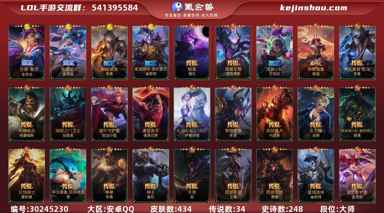 皮肤数:434 典藏皮肤数量:0 神话皮肤数量:4 传说皮肤数量:34 史诗皮肤数量:248 段位:大师 卖家说:434个皮肤,精粹五十多万,里面还有一年大会员,求求号一个皇冠一个太阳三个星星,王者荣耀一百多个皮肤