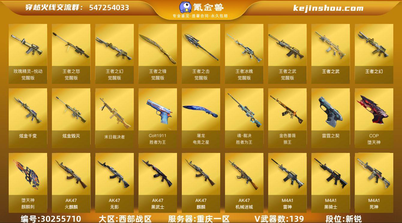 段位:新锐 VIP等级:4 V武器数:139 王者武器数:7 炫金武器数:2 玫瑰精灵-悦动-觉醒版,王者之怒-觉醒版,王者之幻-觉醒版,王者之锋-觉醒版,王者之击-觉醒版,王者冰魄-觉醒版,王者之武-觉醒版,王者之武,王者之幻 炫金千变,炫金毁灭 Colt1911-胜者为王,魂·裁决-胜者为王,金色蔷薇-狼王,末日裁决者,屠龙-电竞之星,雷霆之契,COP-堕天神,麒麟刺-堕天神,AK47-火麒麟,AK47-无影,AK47-黑武士,AK47-麒麟,AK47-机械迷城,M4A1-雷神,M4A1-黑骑士,M4A1-死神,M4A1-黑龙,M4A1-夜魔,M4A1-堕天神,M200-幻神,Barrett-毁灭,Barrett-极光,Barrett-电竞装甲,Barrett-朱雀,AWM-天龙,AWM-裁决,Kar98k-星神,AN94-超新星,QBZ03-金色蔷薇,9A91-烈火,RPK-盘龙,汤姆逊-烈龙,加特林-炼狱,沙鹰-修罗,COP雷霆,沙鹰-天神,屠龙,龙啸,麒麟刺,擎天,裁决,烈龙,盘龙,破空枪刃-夜魔 王者葵-惊若翩鸿,王者-零,王者-零-华冠丽服 葵,星际战将,炫,樱 屠龙-电竞之星-竞星跃动音效卡,星神音效卡,M200-幻神音效卡,Barrett-极光音效卡,Barrett-毁灭音效卡 卖家说:幻神音效卡,星神傲竹金蛇三件套,毁灭星耀三件套,3把cop,一把usp,一把柯尔特