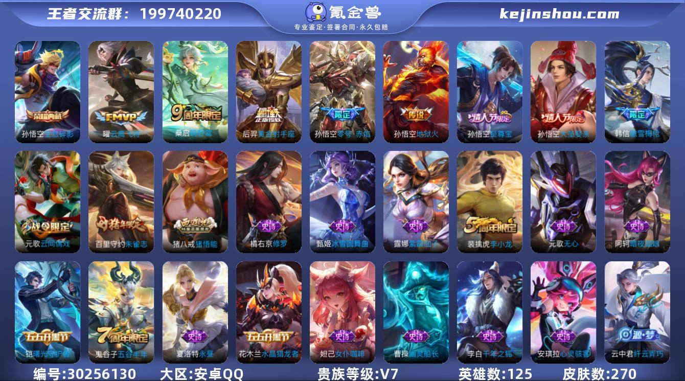 【1水晶6传说4星传至尊宝306幸运值】安卓QQ-125英雄-270皮肤【1水晶】 全息碎影【星元皮肤】幽冥火未来机甲零号雷霆星际治安官【传说皮肤】神树通天 黄金射手座 地狱火 零号·赤焰 云鹰飞将 鸣野蒿【史诗皮肤】大圣娶亲 至尊宝 星界战将 荣光圣徽 顽趣 舞动绿茵 幽灵船长 功夫厨神 修罗 火炮绅士 曙光守护者 暗隐猎兽者 航海奇遇记 千年之狐 逐浪之夏 银河之约 地狱岩魂 绅士熊喵 天才门将 紫霞仙子 狮舞东方 圣诞狂欢 狂想玩偶喵 胡桃异想国 金属风暴 龙骑士 梁祝 李小龙 月团寄思 猫狗日记 水果甜心 蔷薇恋人 乘风破浪 苍穹之光 缤纷独角兽 黎明之约 心灵战警 遇见飞天 摇滚巨星 云间偶戏 纤云弄巧 乱世虎臣 皇家上将 冰雪圆舞曲 猪悟能 高山流水 无心 五谷丰年 未来纪元 吟游魔法 永昼 暗夜猫娘 节奏热浪 心灵骇客 星夜王子 特工魅影 朱雀志 原初追逐者 女仆咖啡 魅力维加斯 魔术师 鹰眼统帅 圣诞恋歌 真爱魔法 鬼剑武藏 傲雪梅枪 水晶猎龙者【勇者皮肤】劲辣红锅 完美运算 古海寻踪 妄想特派 潮玩牛仔 西部游侠 剑破天穹 探海日志 云中旅人 命运角斗场 零食大作战 时尚教父 单词大作战 金庭之子 聚星闪耀 海盐诗旅 时空谍影 漠中幻影 功夫炙烤 归虚梦演 霸王丸 龙腾万里 幻乐之宴 原初探秘者 街头霸王 教廷特使 阿尔法小队 圣弓游侠 兔女郎 炽热元素使 特工战影 功夫老勺 醍醐杖 敏锐之力 虎啸剑宗 万事如意 纽约教父 汉昭烈帝 秘密基地 哥特玫瑰 乓乓大师 黑桃队长 野性能量 红桃皇后 幻夜卜梦 虹云星官 疑决卦 神迹守卫 次元突破 西部大镖客 鲨炮海盗猫 星空之诺 坚韧之力 千军破阵 天使之翼 归虚梦演 沉稳之力 幻想奇妙夜 东方不败 朔风刀 海滩派对 科学大爆炸 丁香结 死亡骑士 潮玩骑士王 混沌棋 五福同心 缤纷绘卷 忍·炎影 花好人间 驱傩正仪 海滩丽影 掌控之力 鲤鱼之梦 奇妙博物学 幻泉雾影 归虚梦演 归...