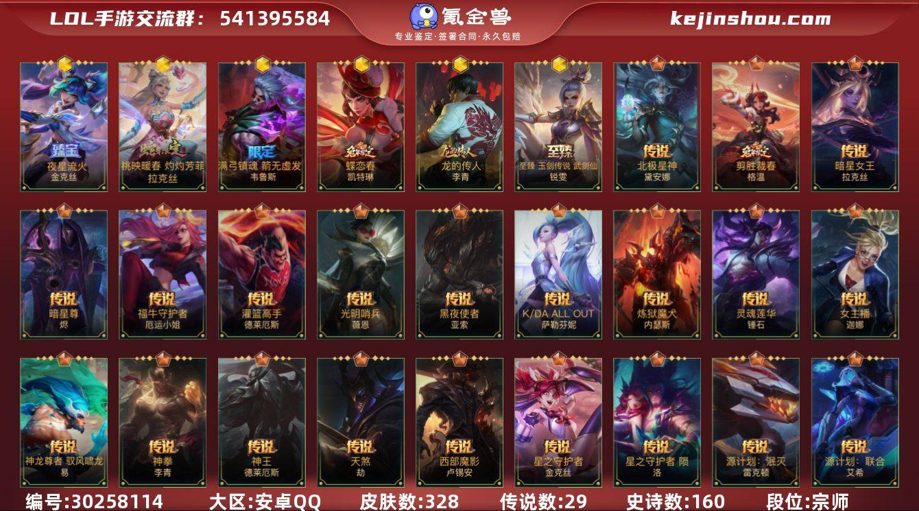 皮肤数:328 典藏皮肤数量:0 神话皮肤数量:6 传说皮肤数量:29 史诗皮肤数量:160 段位:宗师 卖家说:历史国一拉克丝 国三绝世洛 国七露露 国服劫 琴女 机器人 国前十辅助分路 附赠和平粉玛 直升机 升级枪