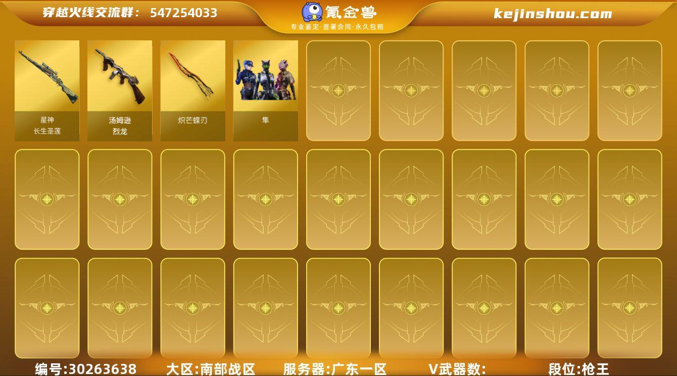段位:枪王 VIP等级:3 星神-长生圣莲,汤姆逊-烈龙,炽芒蝶刃 隼 卖家说:四防隼,六烈蝴蝶,炽芒蝶刃,多小人武器,多平台在售,安全靠谱