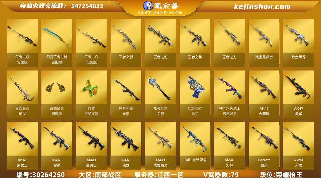 【ky4419】江西一区-84V-11王者-2炫金 【传说角色】:传说星骇 【热门武器】:QBZ03-金色蔷薇,HK417-朱雀,M200-幻神,修罗-古蛇迷踪,死亡之眼,白虎-电玩蓝兔,柯尔特-冠军之特,Kar98K-星神,M4A1-黑骑士,汤姆逊-烈龙*6,沙鹰-修罗*3,炽芒蝶刃,炽芒蝶刃-冠军炽芒皮肤 【王者炫金武器】:王者之幻,王者之势,王者之影,王者之力,炫金黑龙,炫金武士 【音效卡】:Barrett-毁灭音效卡,Kar98K-星神音效卡,Barrett-碧霄极光音效卡,炼狱-百战金芒-庆典舞曲音效卡 【皮肤】:幻神-星耀 皮肤,幻神-动感闪耀 皮肤,幻神-纸灯龙皮肤,幻神-AG-CFPL S24冠军 皮肤,QBZ03-AG-CFPLS19冠军,裁决-巅峰荣耀 皮肤,裁决-羽掣 皮肤,星神-巅峰荣耀 皮肤,雷神-暗月,雷神-荣耀之魄,雷神-宇航兔皮肤,雷神-维纳斯皮肤*2,雷神-源计划2.0专属 皮肤,雷神-化蛇 皮肤,火麒麟-冠军之心,火麒麟-轻羽皮肤*2,火麒麟-巅峰荣耀,火麒麟-心动糖果,毁灭-荣耀之怒,毁灭-SV-CFPLS16冠军,毁灭-星耀 皮肤,毁灭-百城浙江 皮肤,毁灭-虹光风暴 皮肤,毁灭-秦师 皮肤,毁灭-巅峰荣耀 皮肤,毁灭-英雄计划 皮肤,黑龙-能量核心,黑龙-暗月,黑龙-冠军之武,黑骑士-破界 皮肤,无影-暗月,无影-能量核心*2,死神-秘银,天启-暗月*2,战神-粉色甜心皮肤,战神-紫绶金章皮肤*2,战神-流金岁月皮肤,AK47-B-常胜将军-孙权,天龙-能量核心,AWM-天龙-传奇70KG,Barrett-金色蔷薇-蛇姬 皮肤,修罗-能量核心*2,修罗-星空,修罗-冠军之魂,天神-暗月,屠龙-荣耀之锋,屠龙-星耀 皮肤*2,屠龙-春桃 皮肤,屠龙-巅峰荣耀 皮肤,龙啸-纸灯龙皮肤,龙啸-蛇姬 皮肤,擎天-冠军之击,炽芒蝶刃-冠军炽芒皮肤,炽芒蝶刃-巅峰荣耀 皮肤 【角色】:晴雅,隼,雨墨,战地猎狐,蛇隐宗,奇洋探员,乔伊教练,修道士,云海玲珑,炽天使,空,暗夜-X,电...